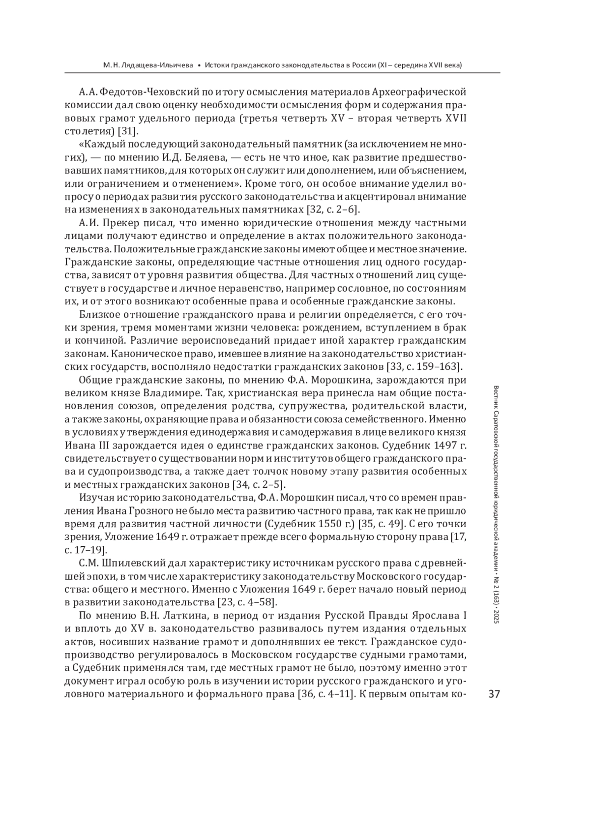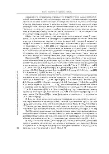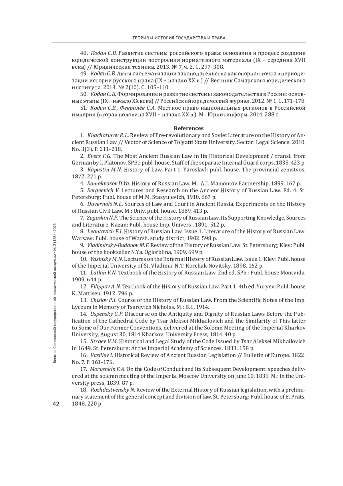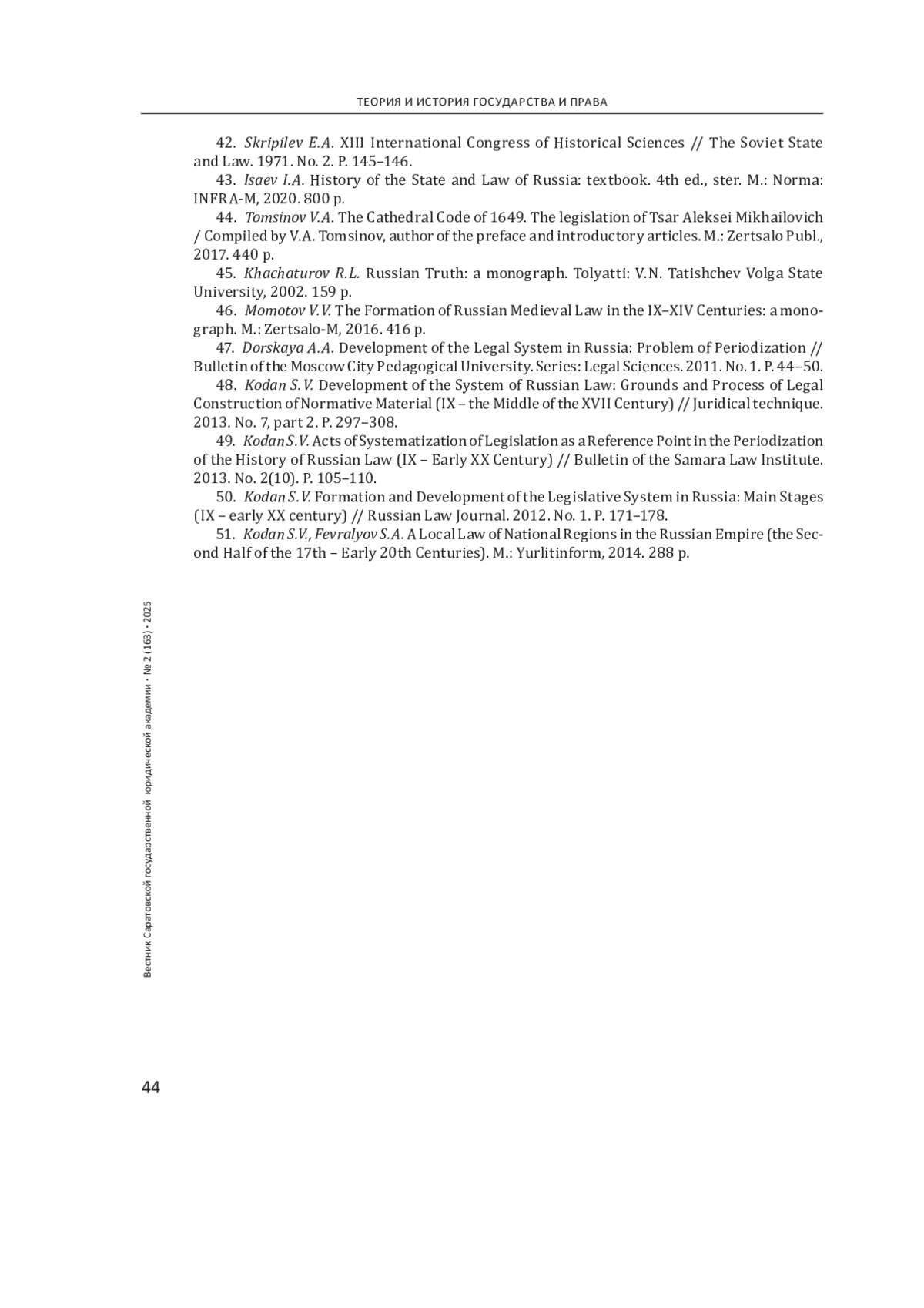 48. Кодан С. В. Развитие системы российского права: основания и процесс создания юридической конструкции построения нормативного материала (IX - середина XVII века) // Юридическая техника. 2013. № 7, ч. 2. С. 297-308. EDN: RBRSHJ