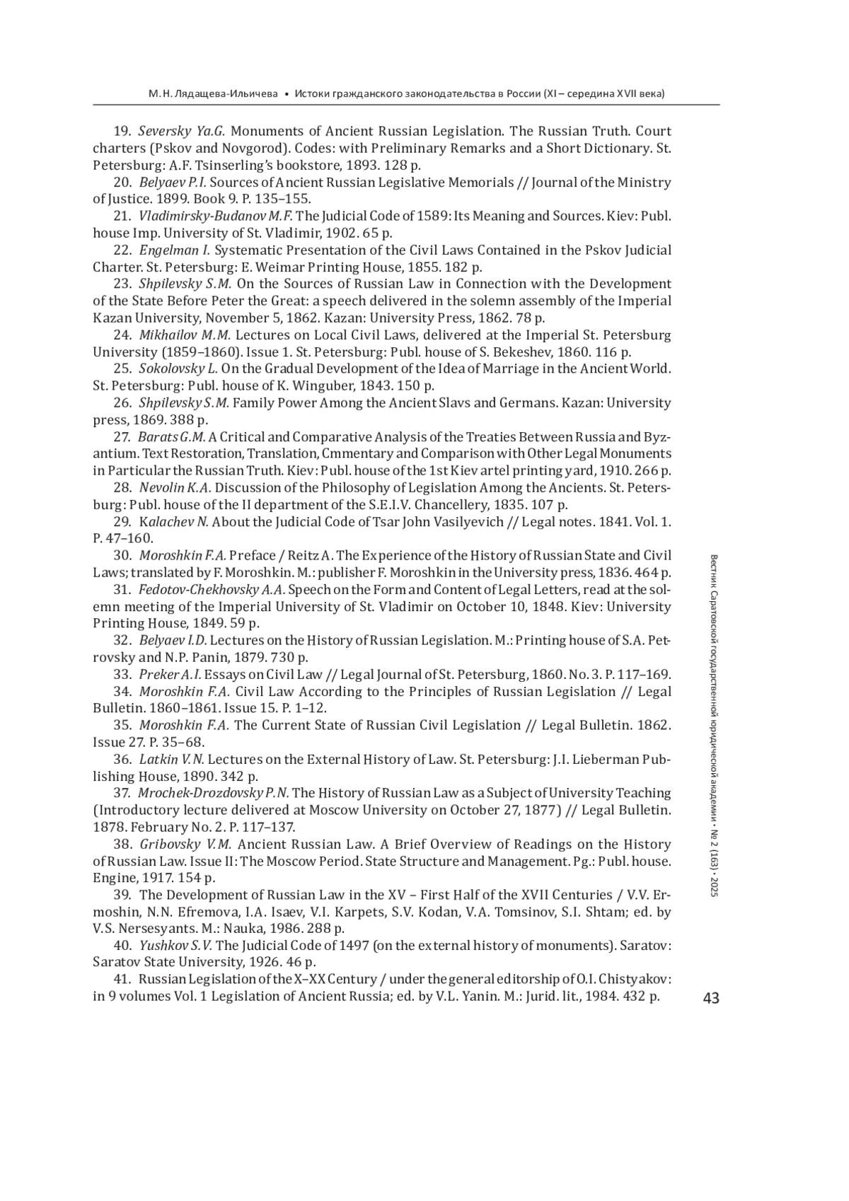 16. Васильев Ил. Историческое обозрение древнего российского законодательства // Вестник Европы. 1822. № 7. С. 161-175.