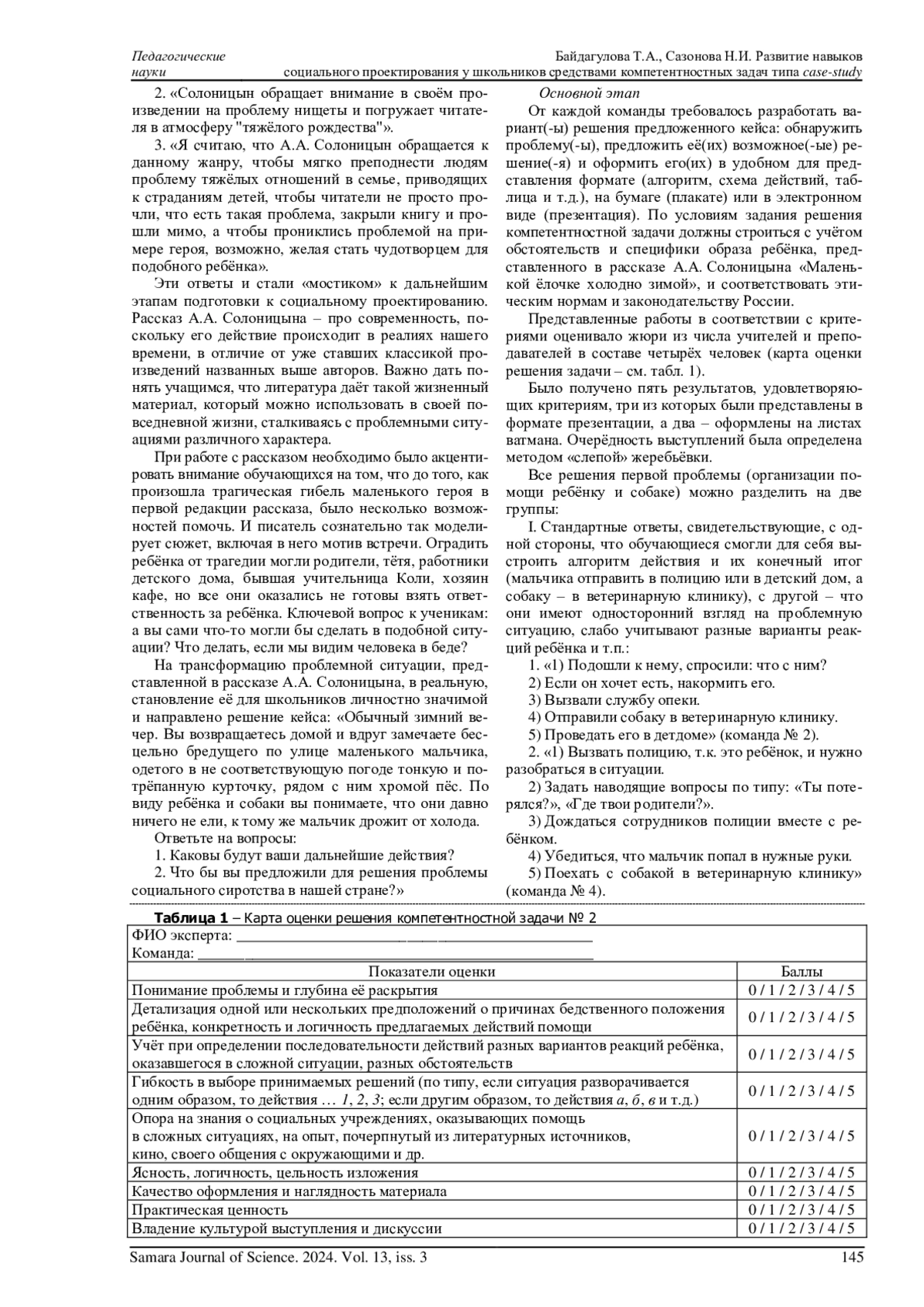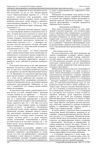 Во ФГОС ООО подчеркнута практико-ориентированность современного образования, которая требует от обучающихся не только получения знаний, но и умения применять их в реальных жизненных ситуациях. В статье описывается опыт разработки, проектирования и апробации в педагогической практике компетентностных задач, основанных на методе case-study, для развития у школьников навыков социального проектирования и метанавыков. В исследовании изучалась возможность применения кейс-метода для формирования у учащихся навыков критического мышления, анализа и разработки решений социально значимых проблем. В качестве материала был использован рождественский рассказ с социальной проблематикой. Ученики 6-8 классов, работая в группах и индивидуально, анализировали проблемные ситуации и разрабатывали проектные решения, представленные затем в форме презентации. Результаты показали, что компетентностные задачи развивают у школьников гибкость мышления, способность оценивать ситуации с разных позиций и принимать аргументированные решения. В заключение авторы анализируют описанные прецеденты образовательного процесса и делают выводы о совершенствовании разработанных и апробированных материалов по внедрению метода case-study в образовательный процесс. Отмечается, что использование компетентностных задач на основе кейс-метода может быть эффективным инструментом для воспитания социальной ответственности и формирования гражданской позиции у школьников.