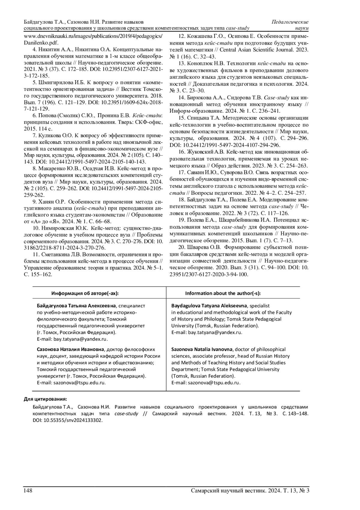 20. Шварева О.В. Формирование субъектной позиции бакалавров средствами кейс-метода и моделей организации совместной деятельности // Научно-педагогическое обозрение. 2020. Вып. 3 (31). С. 94-100. DOI: 10.23951/2307-6127-2020-3-94-100 EDN: AMFYQW