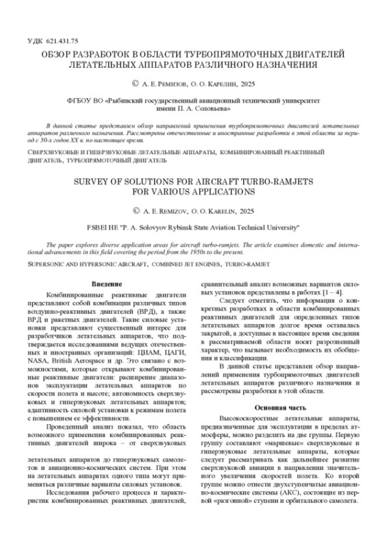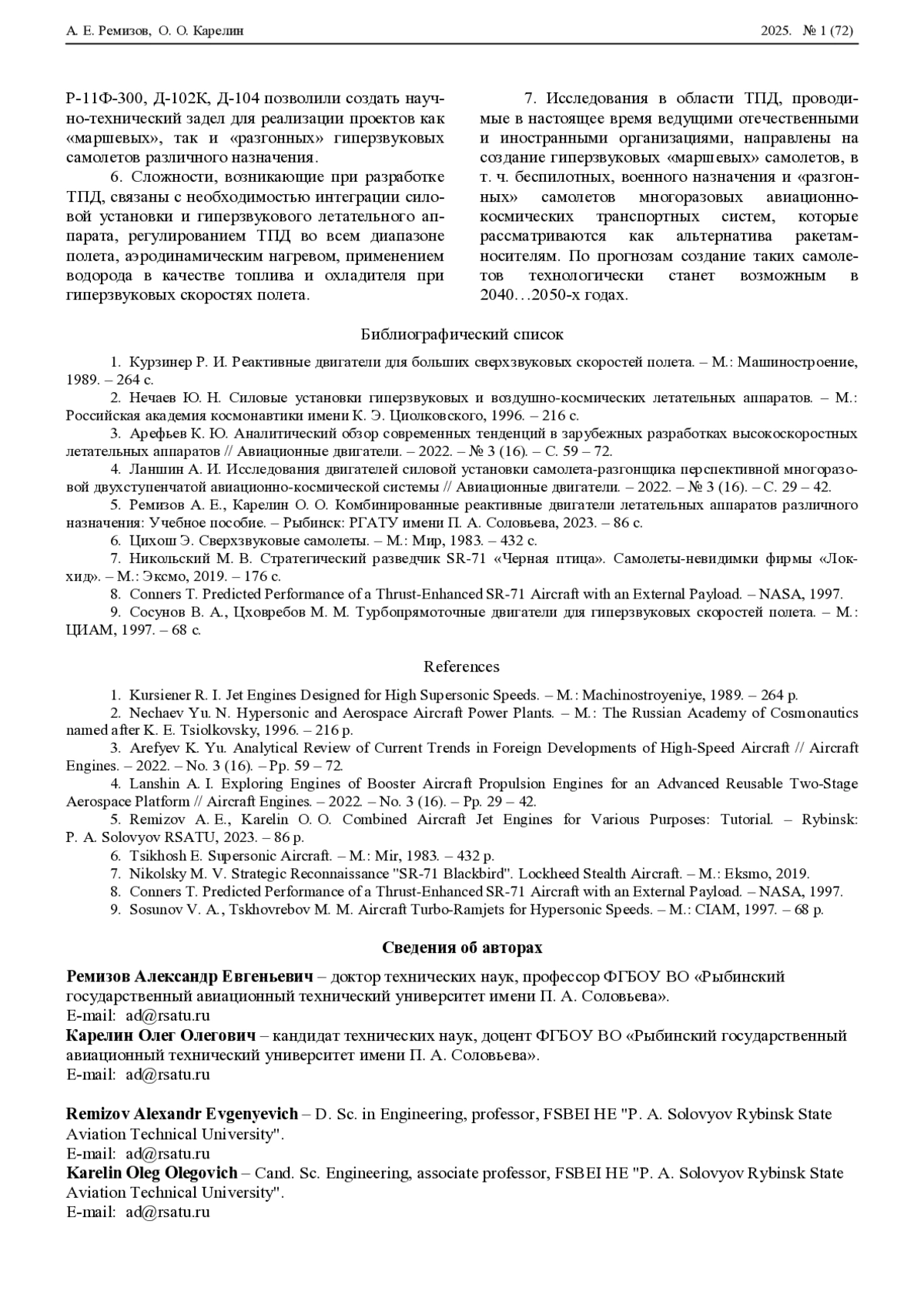 5. 	Ремизов А. Е., Карелин О. О. Комбинированные реактивные двигатели летательных аппаратов различного назначения: Учебное пособие. - Рыбинск: РГАТУ имени П. А. Соловьева, 2023. - 86 с.
