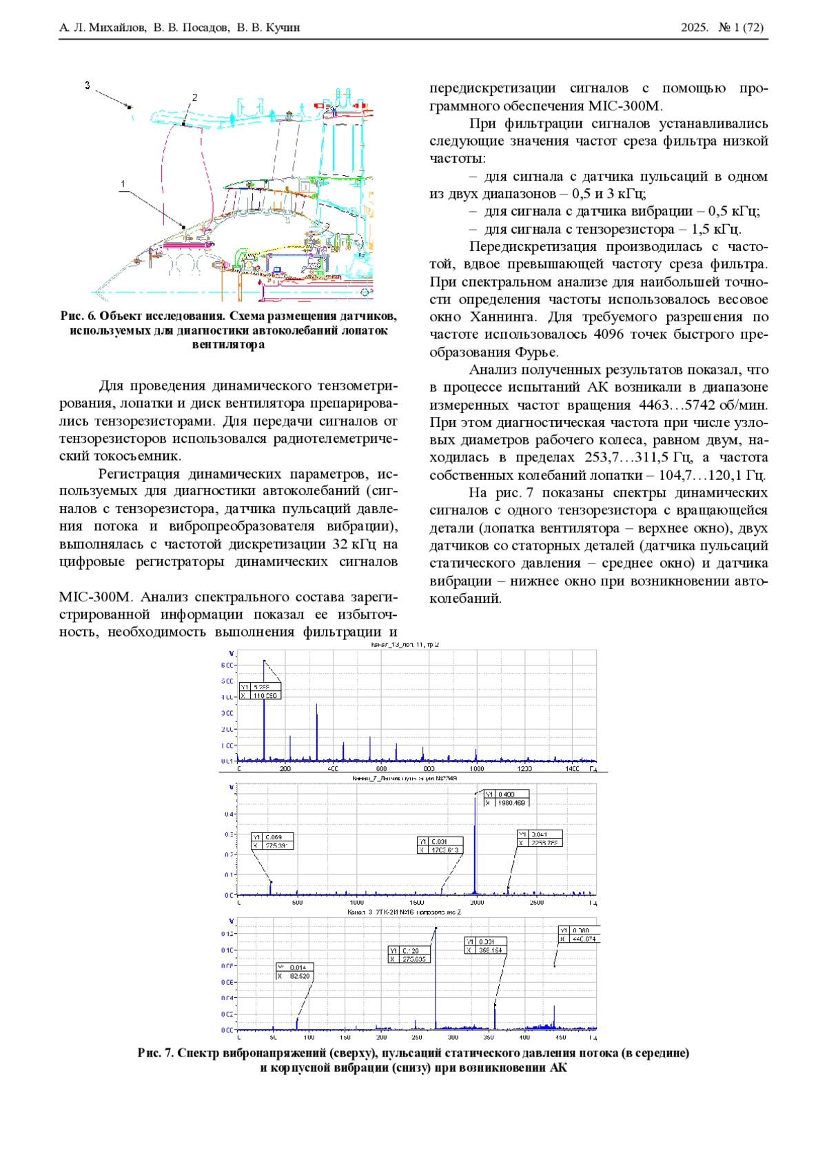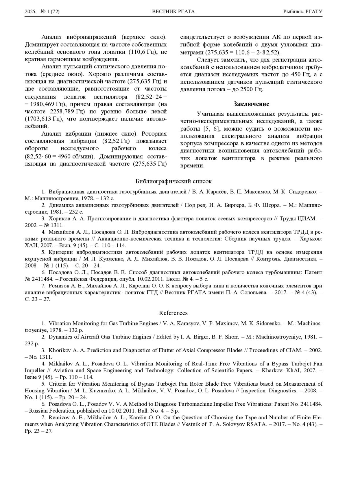 4. 	Михайлов А. Л., Посадова О. Л. Вибродиагностика автоколебаний рабочего колеса вентилятора ТРДД в режиме реального времени // Авиационно-космическая техника и технология: Сборник научных трудов. - Харьков: ХАИ, 2007. - Вып. 9 (45). - С. 110 - 114.