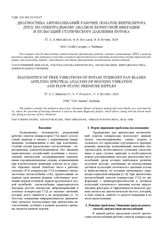 Рассмотрен способ диагностики автоколебаний (флаттера) рабочих лопаток вентилятора ДТРД в режиме реального времени, при котором в качестве основного диагностического признака используют спектр корпусной вибрации, что позволяет, наряду с известными способами, фиксировать возникновение автоколебаний