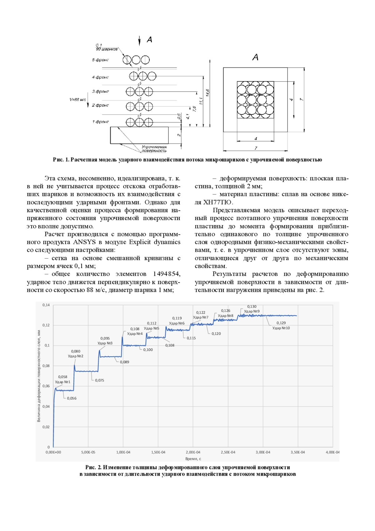 Процессы упрочнения потоком ударных тел наиболее нагруженных деталей газотурбинных двигателей, в частности лопаток компрессоров, в современном авиационном машиностроении практически не имеют альтернативы. Это явление объясняется тем, что процесс упрочнения в этом случае носит локальный характер, осуществляется исключительно в области контакта распыляемого факела упрочняющих частиц с поверхностью детали, подлежащей упрочнению. Площадь контакта на практике составляет не более 100…200 мм2, что на несколько порядков меньше, чем упрочняемая поверхность всей детали. При этом траектория движения сопла по поверхности детали представляет собой совокупность продольных и поперечных строк. Направление строк, их длина, площадь фокусного пятна по поверхности детали могут варьироваться в зависимости от формы, толщины, кривизны и прочих характеристик упрочняемой поверхности