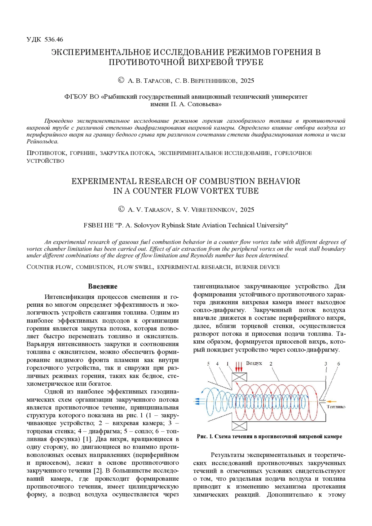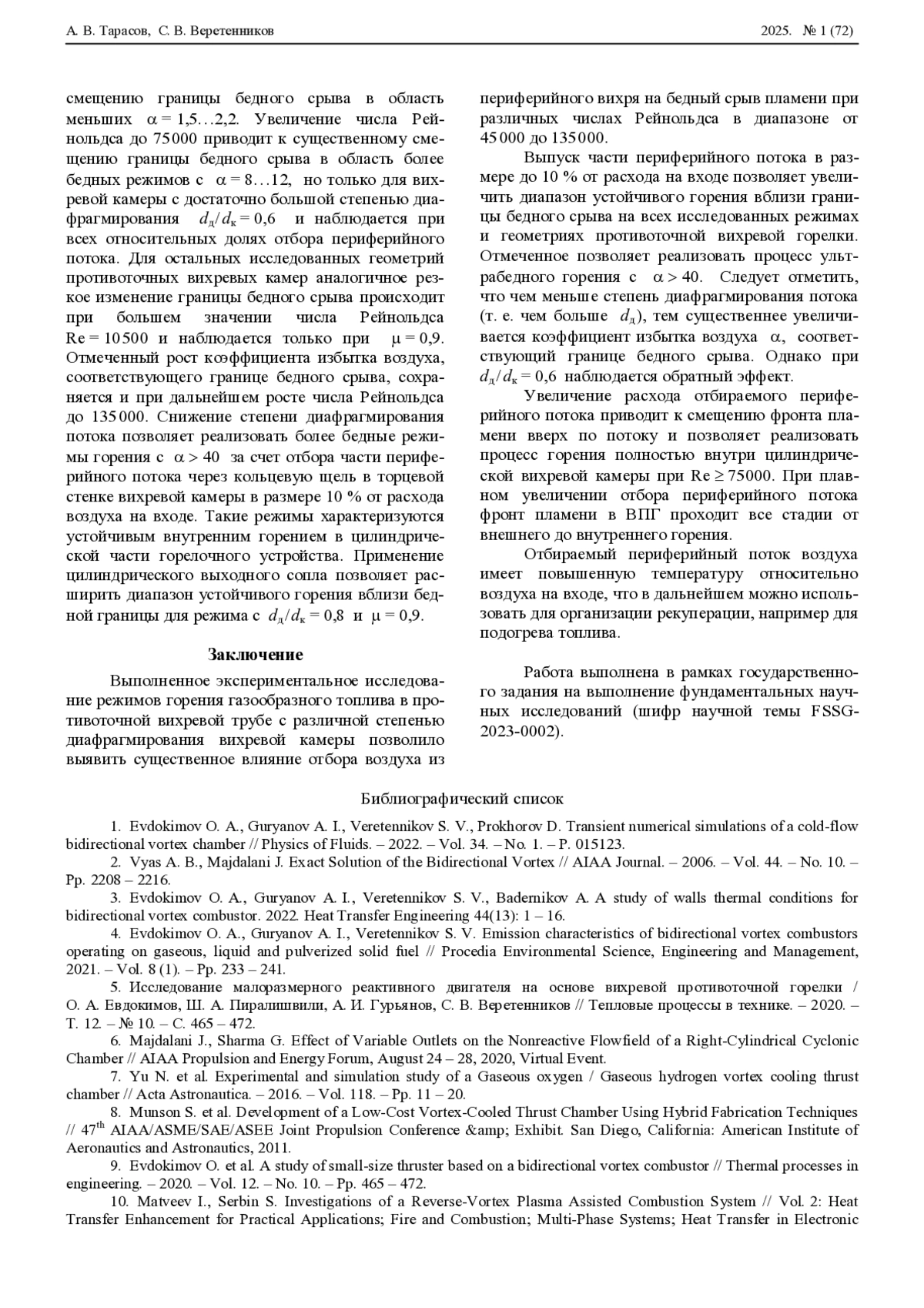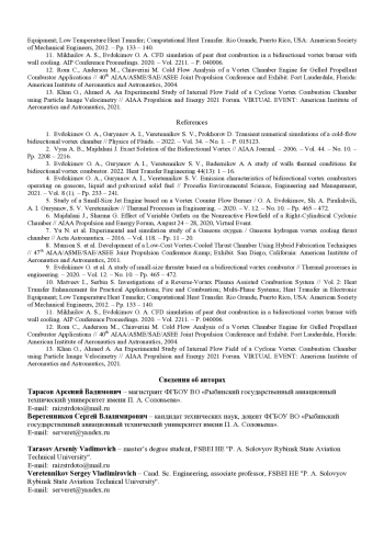 9. 	Evdokimov O. et al. A study of small-size thruster based on a bidirectional vortex combustor // Thermal processes in engineering. - 2020. - Vol. 12. - No. 10. - Pp. 465 - 472.