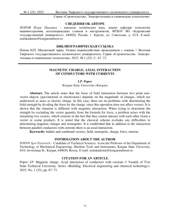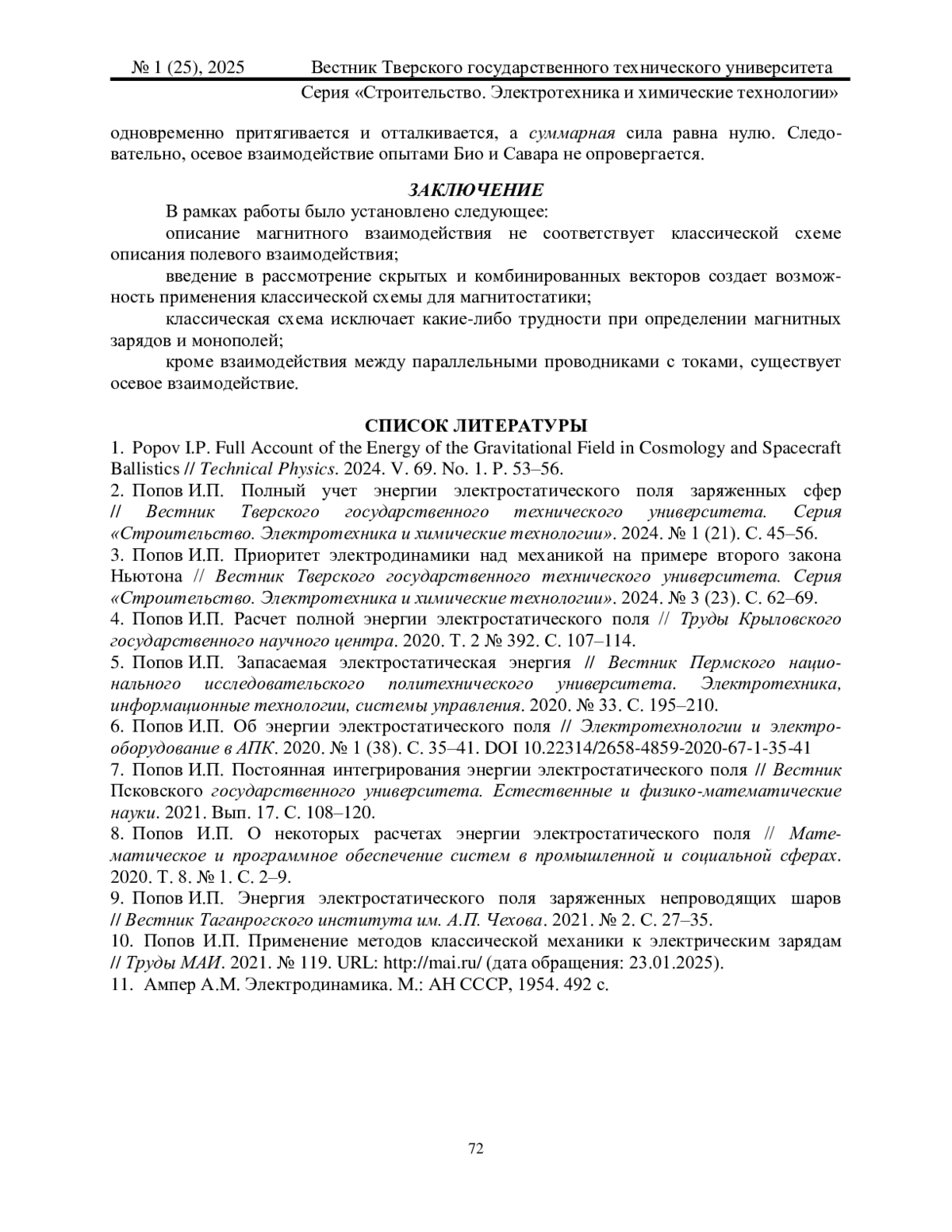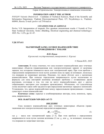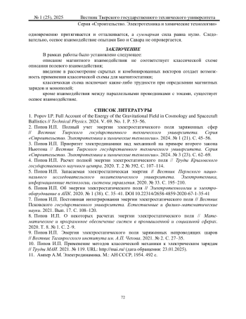 2. 	Попов И.П. Полный учет энергии электростатического поля заряженных сфер // Вестник Тверского государственного технического университета. Серия “Строительство. Электротехника и химические технологии”. 2024. № 1 (21). С. 45-56.  EDN: KMUMKI