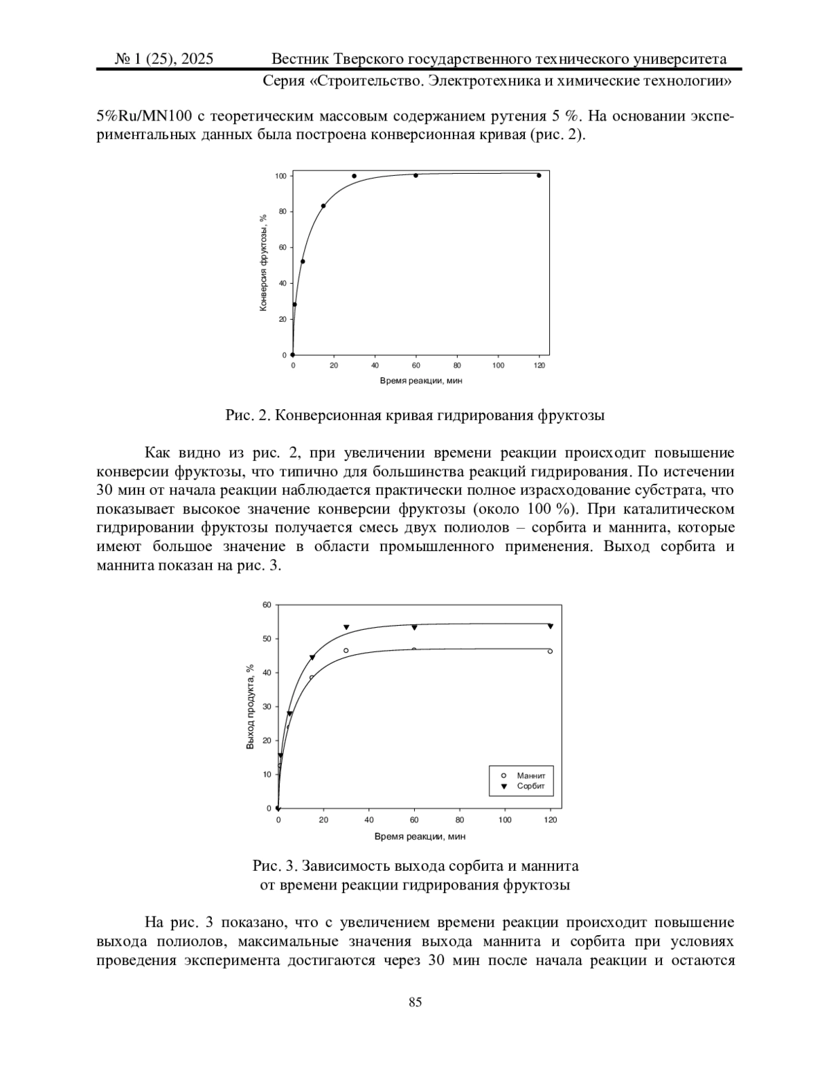 В статье приведены данные об использовании гетерогенных каталитических систем в процессе гидрирования фруктозы до полиолов – сорбита и маннита, имеющих большое промышленное значение. Представлены результаты кинетического тестирования синтезированного с помощью сверхсшитого полистирола марки MN100 рутенийсодержащего катализатора. Установлено, что он характеризуется высокой активностью в гидрировании фруктозы, способен проводить процесс гидрирования с практически 100%-й конверсией субстрата. Продуктами гидрирования служили только сорбит и маннит, выход маннита был немного ниже, чем сорбита, и составлял 47 %. Проведено сравнение катализатора 5%Ru/MN100 с коммерческим 5%Ru/C по конверсии фруктозы и выходу маннита. Показано, что используемый катализатор превосходит катализатор 5%Ru/C не только по активности, но и по выходу маннита.