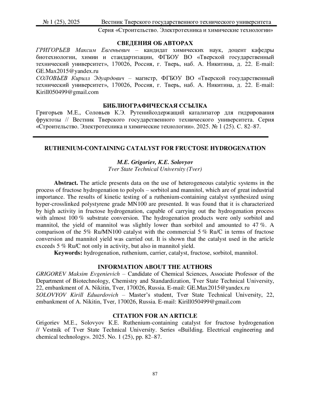 5. 	Zelin J., Regenhardt S.A., Meyer C.L., Duarte H.A., Sebastian V., Marchi A.J., Selective Aqueous-phase Hydrogenation of D-fructose into D-mannitol Using a Highly Efficient and Reusable Cu-Ni/SiO2 Catalyst // Chemical Engineering Science. 2019. No. 206. P. 315-326.