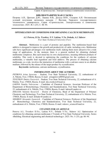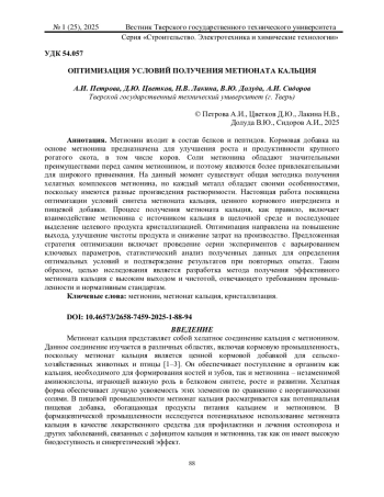Метионин входит в состав белков и пептидов. Кормовая добавка на основе метионина предназначена для улучшения роста и продуктивности крупного рогатого скота, в том числе коров. Соли метионина обладают значительными преимуществами перед самим метионином, и поэтому являются более привлекательными для широкого применения. На данный момент существует общая методика получения хелатных комплексов метионина, но каждый металл обладает своими особенностями, поскольку имеются разные произведения растворимости. Настоящая работа посвящена оптимизации условий синтеза метионата кальция, ценного кормового ингредиента и пищевой добавки. Процесс получения метионата кальция, как правило, включает взаимодействие метионина с источником кальция в щелочной среде и последующее выделение целевого продукта кристаллизацией. Оптимизация направлена на повышение выхода, улучшение чистоты продукта и снижение затрат на производство. Предложенная стратегия оптимизации включает проведение серии экспериментов с варьированием ключевых параметров, статистический анализ полученных данных для определения оптимальных условий и подтверждение результатов при повторных опытах. Таким образом, целью исследования является разработка метода получения эффективного метионата кальция с высоким выходом и чистотой, отвечающего требованиям промышленности и нормативным стандартам