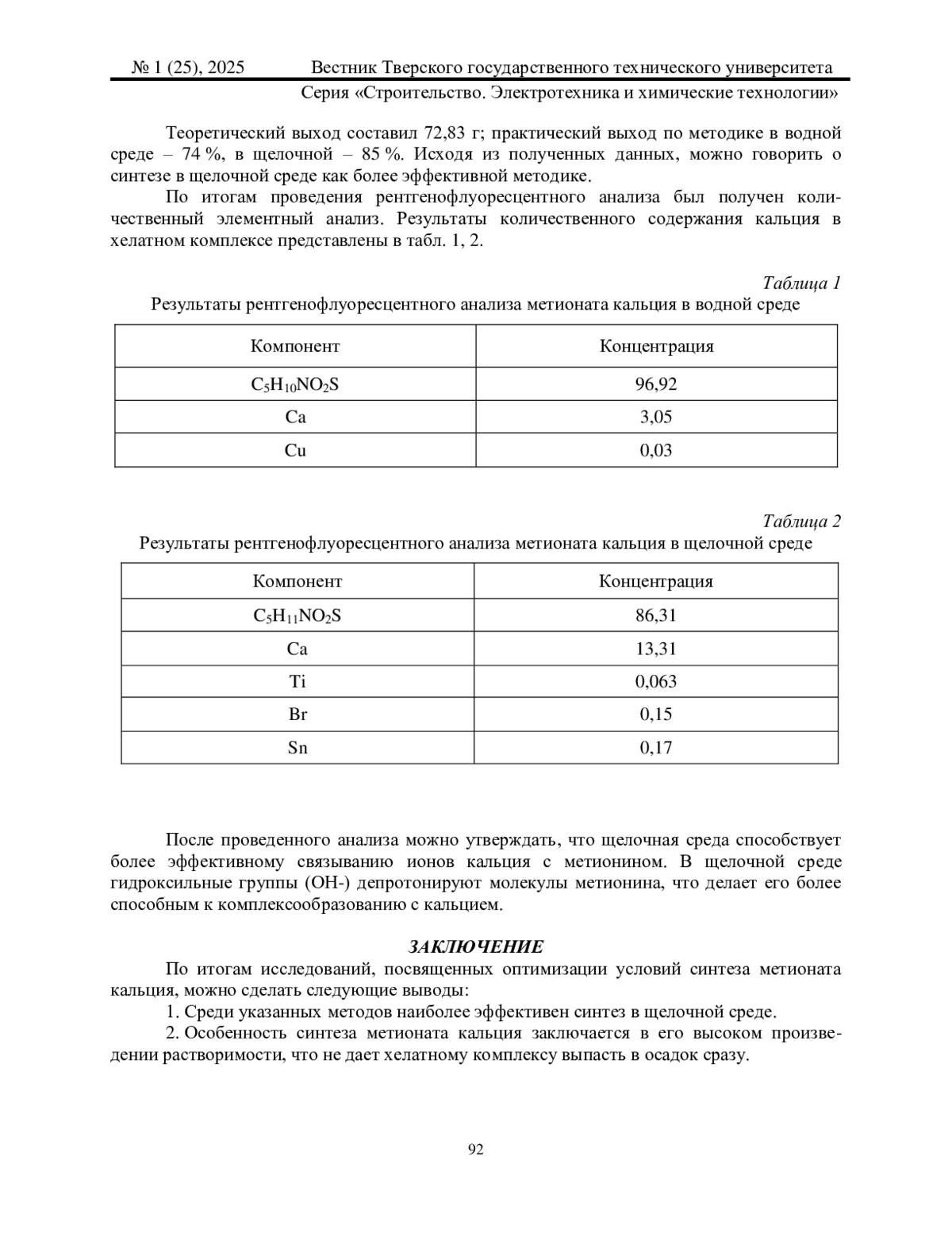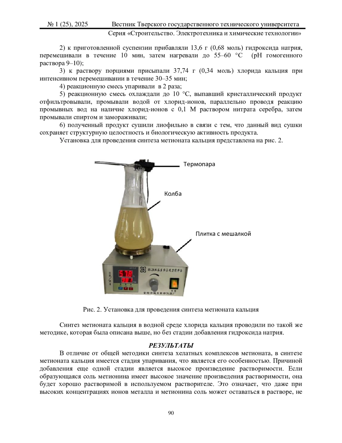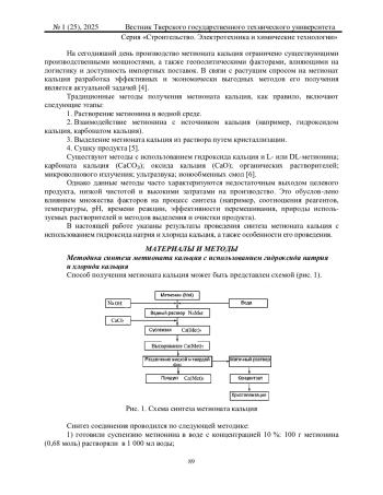 Метионат кальция представляет собой хелатное соединение кальция с метионином. Данное соединение изучается в различных областях, включая кормовую промышленность, поскольку метионат кальция является ценной кормовой добавкой для сельскохозяйственных животных и птицы [1–3]. Он обеспечивает поступление в организм как кальция, необходимого для формирования костей и зубов, так и метионина – незаменимой аминокислоты, играющей важную роль в белковом синтезе, росте и развитии. Хелатная форма обеспечивает лучшую усвояемость этих элементов по сравнению с неорганическими солями. В пищевой промышленности метионат кальция рассматривается как потенциальная пищевая добавка, обогащающая продукты питания кальцием и метионином. В фармацевтической промышленности исследуется потенциальное использование метионата кальция в качестве лекарственного средства для профилактики и лечения остеопороза и других заболеваний, связанных с дефицитом кальция и метионина, так как он имеет высокую биодоступность и синергетический эффект.