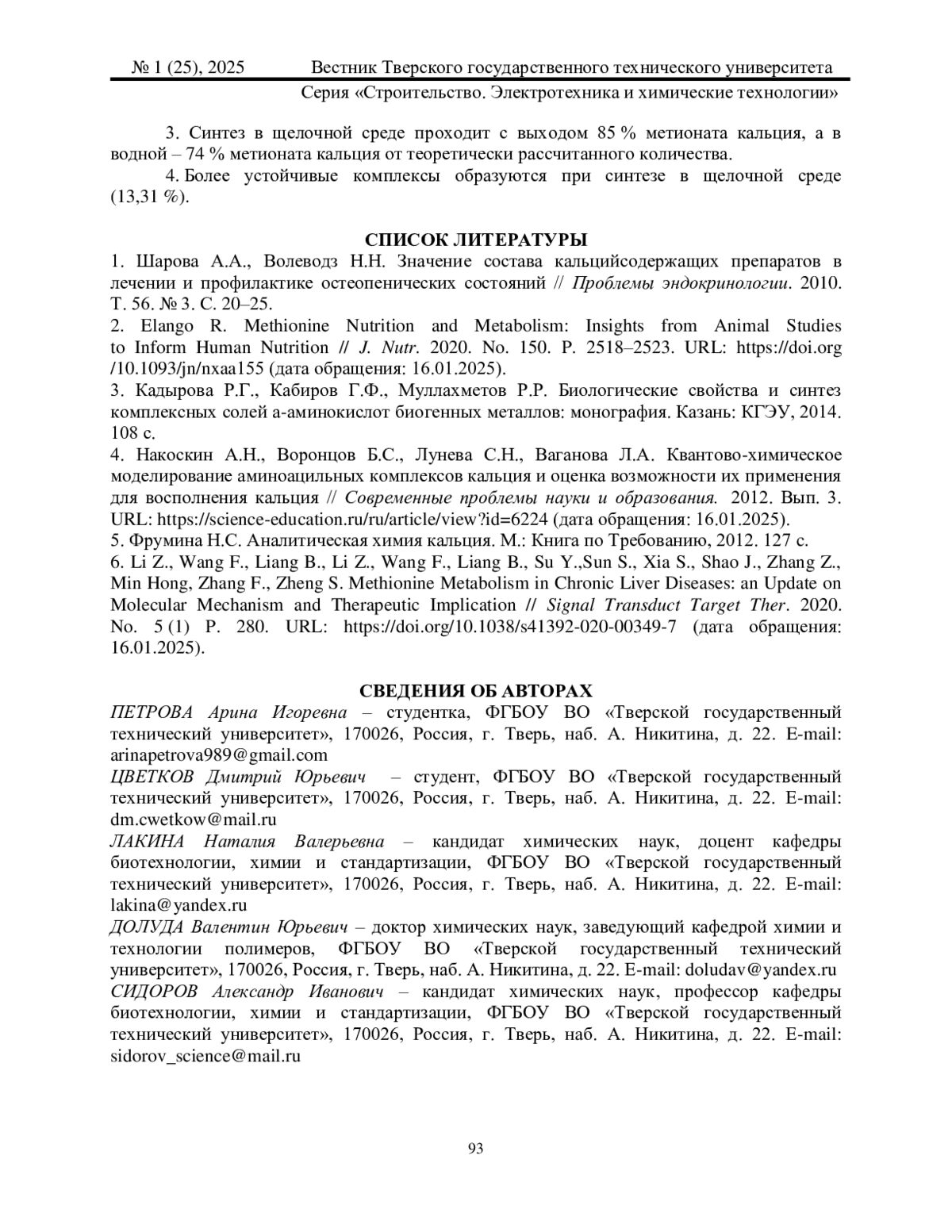 4. 	Накоскин А.Н., Воронцов Б.С., Лунева С.Н., Ваганова Л.А. Квантово-химическое моделирование аминоацильных комплексов кальция и оценка возможности их применения для восполнения кальция // Современные проблемы науки и образования. 2012. Вып. 3. URL: https://science-education.ru/ru/article/view?id=6224 (дата обращения: 16.01.2025). EDN: PAAHFH