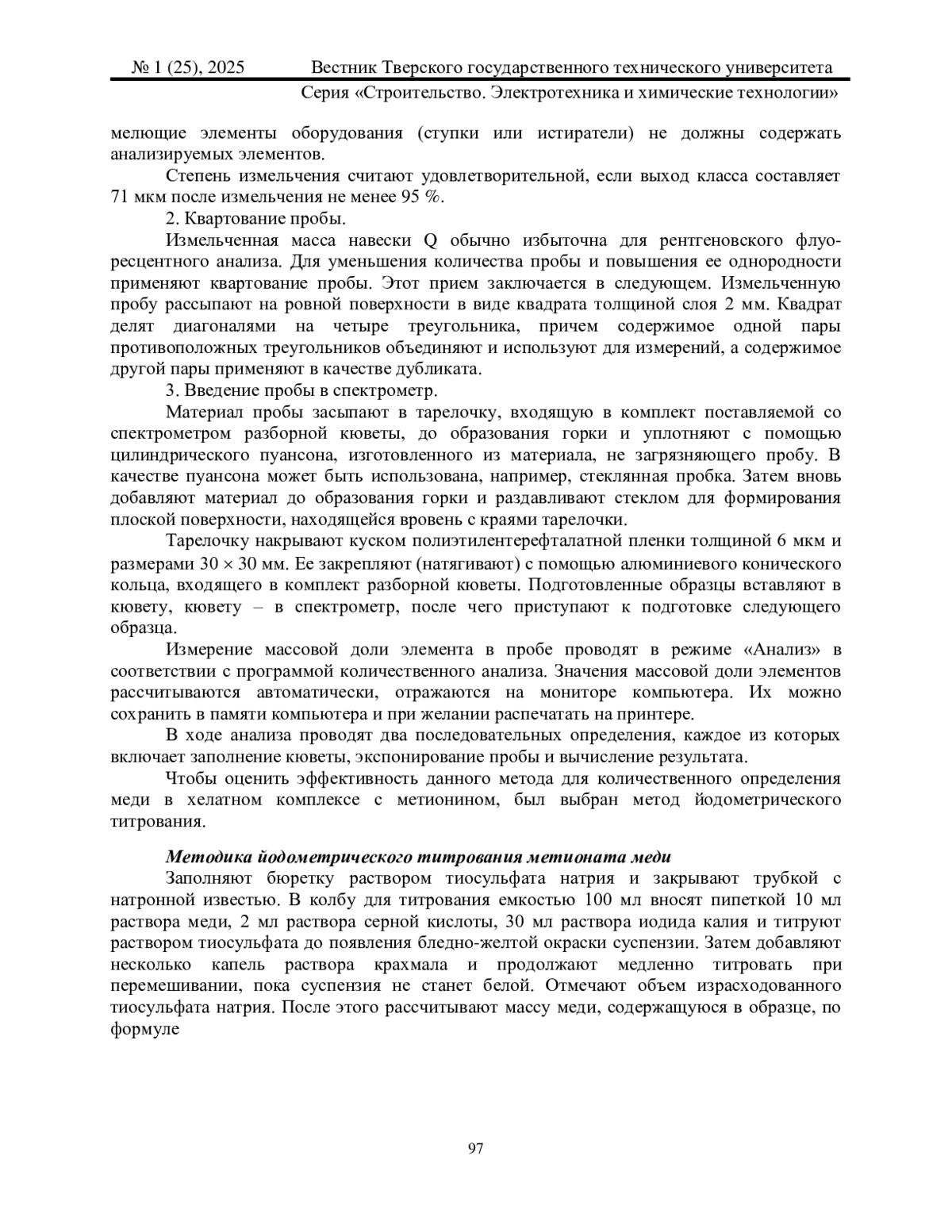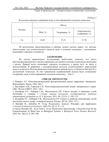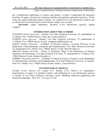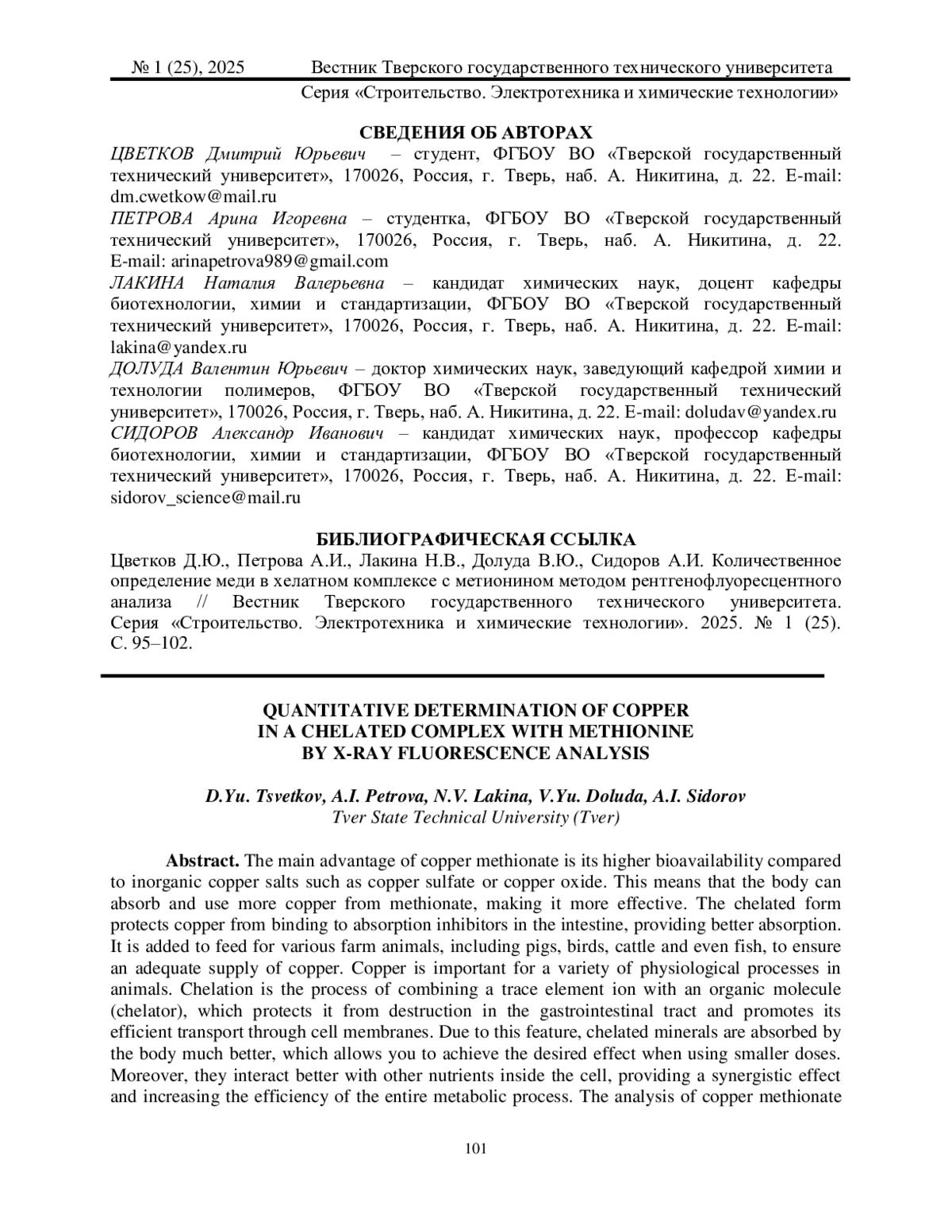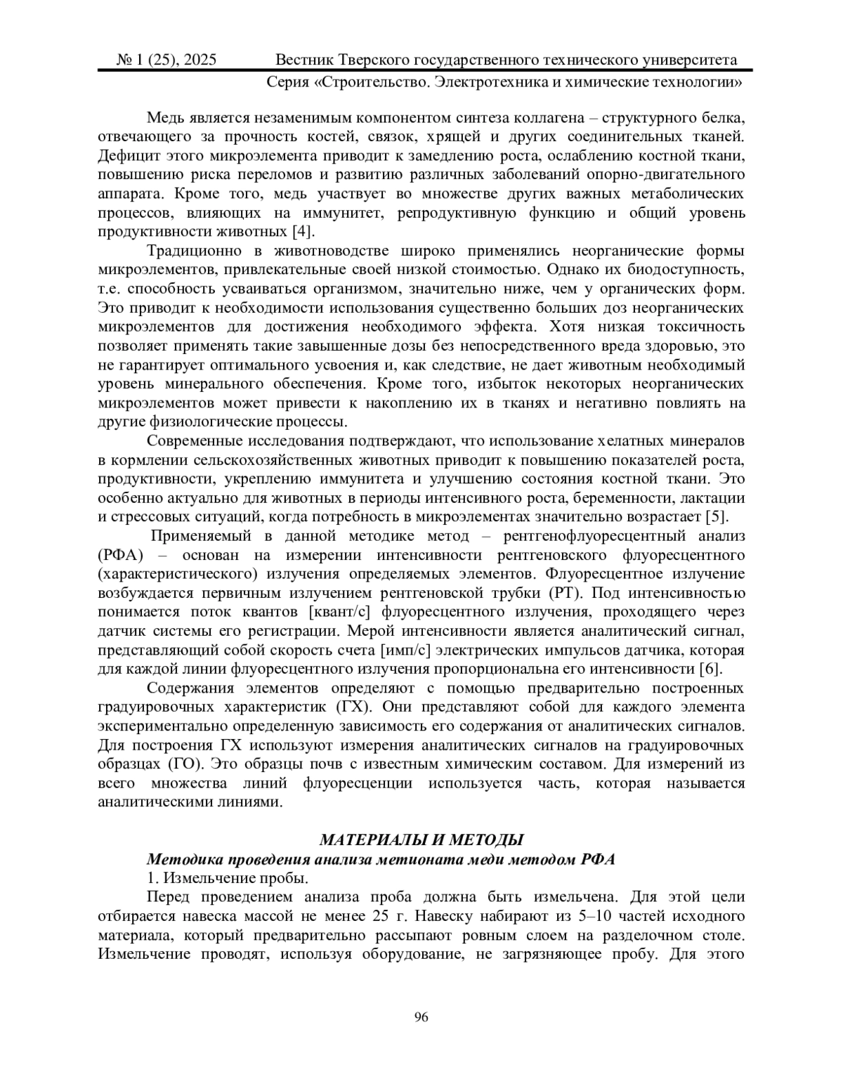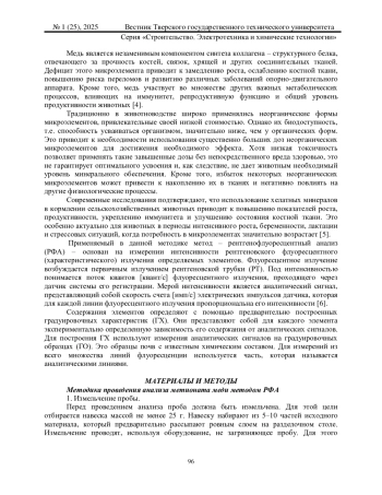 В статье отмечено, что главное преимущество метионата меди заключается в более высокой биодоступности по сравнению с неорганическими солями меди, такими как сульфат меди или оксид меди. Таким образом, организм может усвоить и использовать больше меди из метионата, что делает его более эффективным. Хелатная форма защищает медь от связывания с ингибиторами абсорбции в кишечнике, обеспечивая лучшее усвоение. Метионат меди добавляется в корма для различных сельскохозяйственных животных, включая свиней, птиц, крупный рогатый скот и даже рыбу, чтобы обеспечить адекватное поступление меди. Медь важна для множества физиологических процессов у животных. Хелатирование – это процесс соединения иона микроэлемента с органической молекулой (хелатором), что защищает молекулу-хелатор от разрушения в желудочно-кишечном тракте и способствует ее эффективной транспортировке через клеточные мембраны. Благодаря данной особенности хелатные минералы усваиваются организмом значительно лучше, и это позволяет достичь желаемого эффекта при использовании меньших доз. Более того, хелатные минералы лучше взаимодействуют с другими питательными веществами внутри клетки, обеспечивая синергетический эффект и повышая эффективность всего процесса обмена веществ. Анализ метионата меди имеет многостороннее значение в науке и практике. В настоящей работе был проведен анализ хелатного комплекса метионата меди методом рентгенофлуоресцентного анализа и выявлена его эффективность для анализа металла в хелатном комплексе