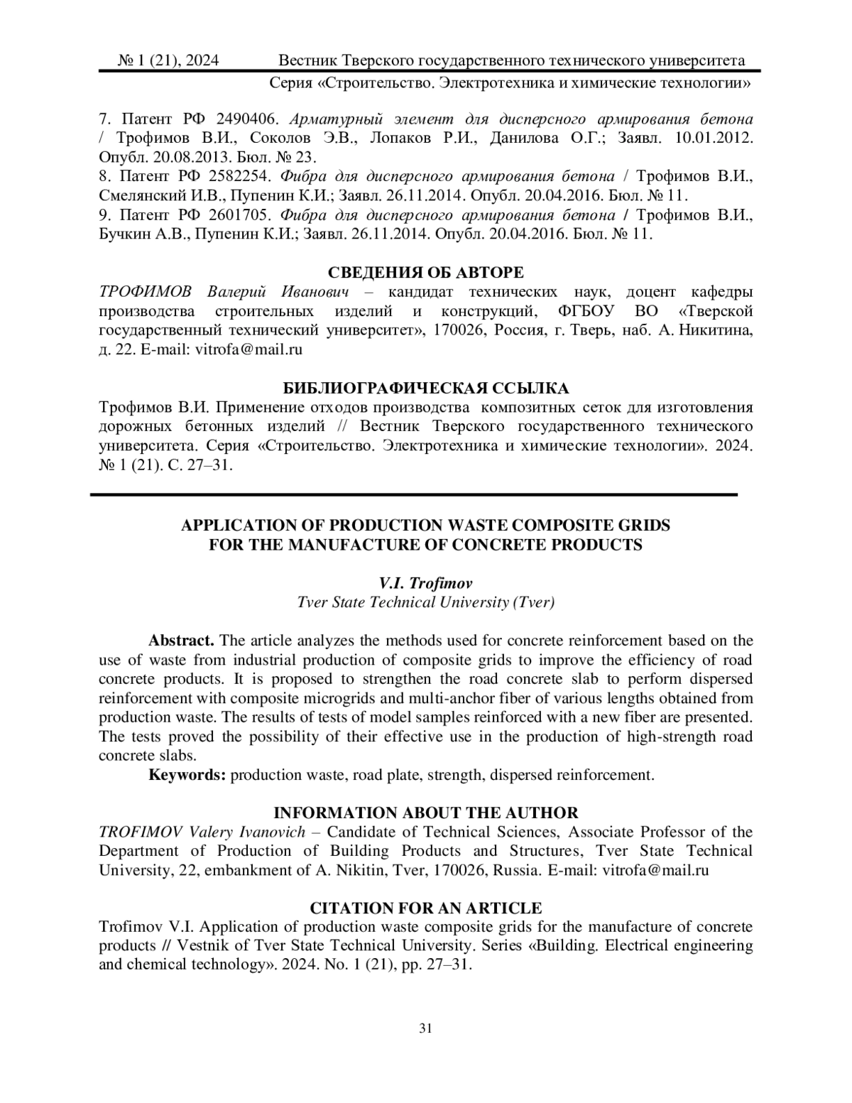 8. 	Патент РФ 2582254. Фибра для дисперсного армирования бетона / Трофимов В.И., Смелянский И.В., Пупенин К.И.; Заявл. 26.11.2014. Опубл. 20.04.2016. Бюл. № 11.