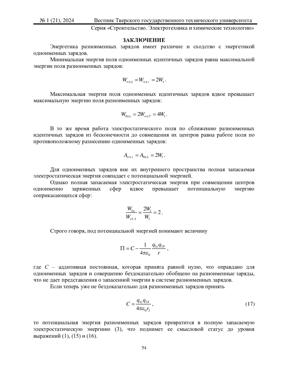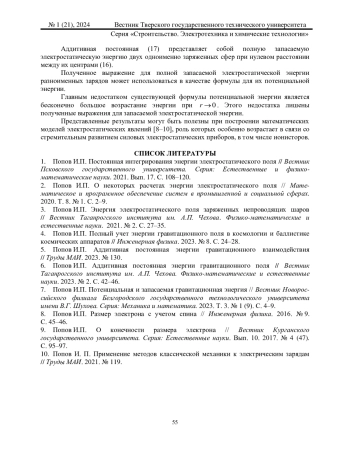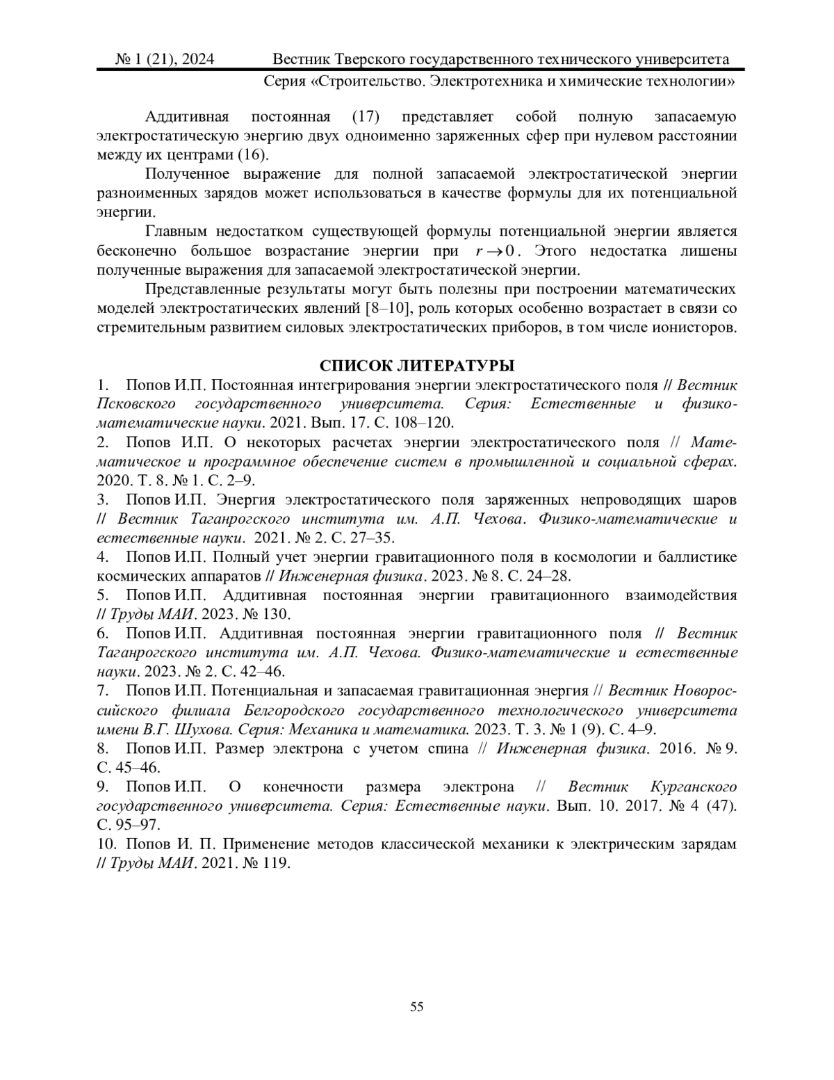 1. Попов И.П. Постоянная интегрирования энергии электростатического поля // Вестник Псковского государственного университета. Серия: Естественные и физико-математические науки. 2021. Вып. 17. С. 108-120. EDN: EFNOCJ