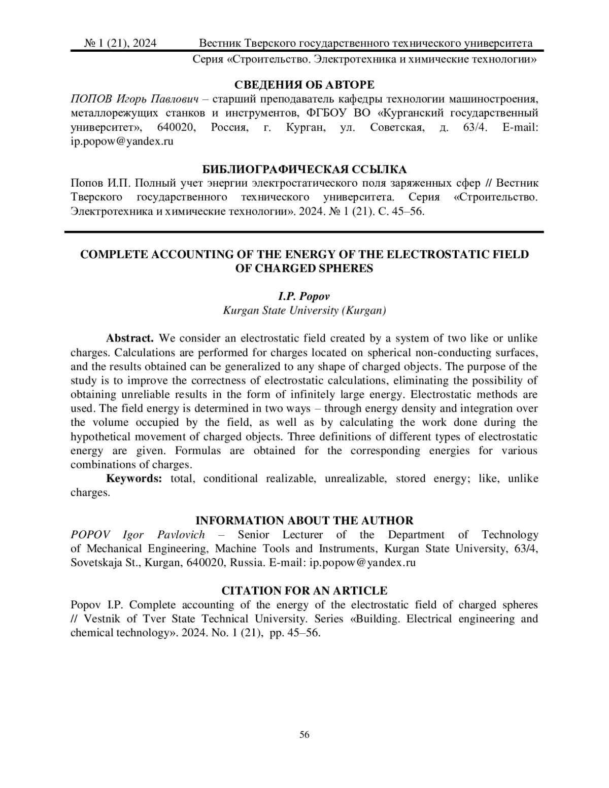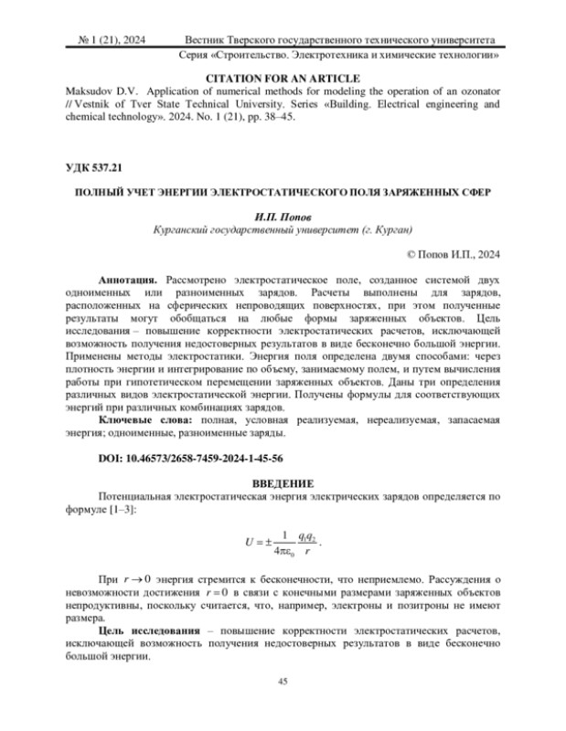 2. Попов И.П. О некоторых расчетах энергии электростатического поля // Математическое и программное обеспечение систем в промышленной и социальной сферах. 2020. Т. 8. № 1. C. 2-9. EDN: CNWRTT
