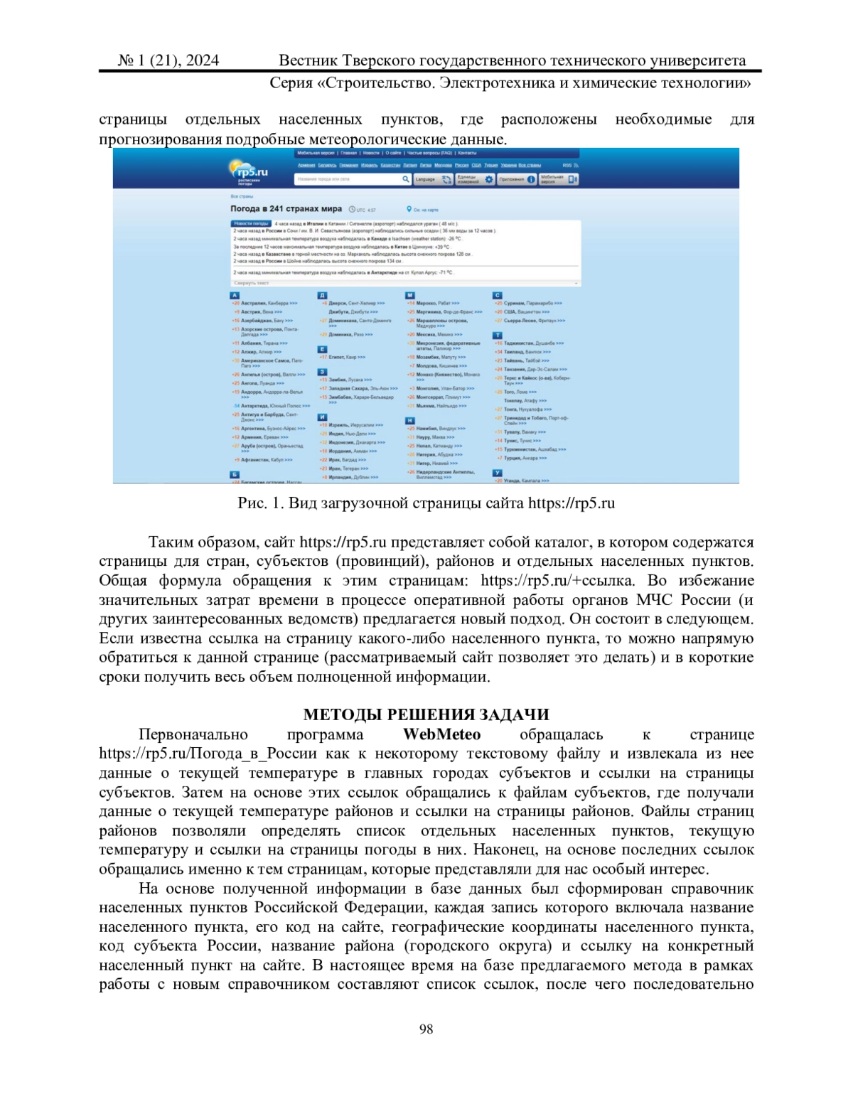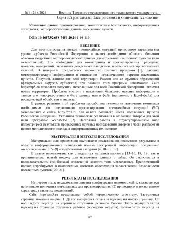 Для прогнозирования рисков чрезвычайных ситуаций природного характера (на уровне субъекта Российской Федерации и выше) необходимо обладать большим объемом подробных метеорологических данных для отдельных населенных пунктов (или метеостанций). Это необходимо для мониторинга и прогнозирования природных пожаров, наводнений, вызванных дождевыми паводками, и опасных метеорологических явлений. В интернете предлагается множество готовых программ [1], дающих метеорологическую информацию в отношении ограниченного перечня населенных пунктов. Получить данные для всей территории России или ее крупных образований (федеральных округов, субъектов) при помощи этих программ невозможно. Сайт https://rp5. ru позволяет получить метеоданные для всей Российской Федерации, включая новые территории. Проблема состоит в извлечении большого массива информации и записи его непосредственно в базу данных или в файл (например, в Excel-файл) для последующей обработки и анализа