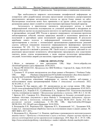 9. 	Федюшкин Н.А., Федосин С.А. Понятие, проблемы и разновидности интеллектуального анализа текста // Проблемы и достижения в науке и технике: сборник научных трудов по итогам международной научно-практической конференции. 2016. Вып. III. С. 39-41. URL: https://izron.ru/articles/problemy-i-dostizheniya-v-nauke-i-tekhnike-sbornik-nauchnykh-trudov-po-itogam-mezhdunarodnoy-nauchno/sektsiya-2-informatika-vychislitelnaya-tekhnika-i-uprav lenie-spetsialnost-05-13-00/po nyatie-problemy-i-raznovidnosti-intellektualnogo-analiza-teksta/(дата обращения: 26.04.2024).  EDN: VYRRZP