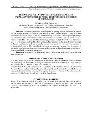 В статье описана технология по извлечению из интернет-сайта метеоданных для большого числа населенных пунктов. Метод основан на анализе строк файлов, представляющих отдельные страницы сайта. Технология использует как стандартную методику парсинга, так и принципиально иной подход для извлечения данных, рассмотрению которого и посвящена данная статья. Планируемым результатом внедрения этой технологии, находящейся в стадии апробации, будет повышение уровня полноты и обоснованности экологической информации о состоянии окружающей среды в населенных пунктах и, как следствие, расширение возможности заблаговременного прогнозирования экологически неблагоприятных, природных и техногенных чрезвычайных ситуаций, планирование комплекса мер по защите населения, природной среды и объектов экономики от угроз возникновения чрезвычайных ситуаций и их негативных последствий.
