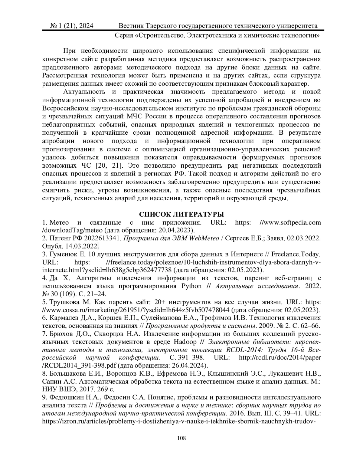 4. 	Да Х. Алгоритмы извлечения информации из текстов, парсинг веб-страниц с использованием языка программирования Python // Актуальные исследования. 2022. № 30 (109). С. 21-24.