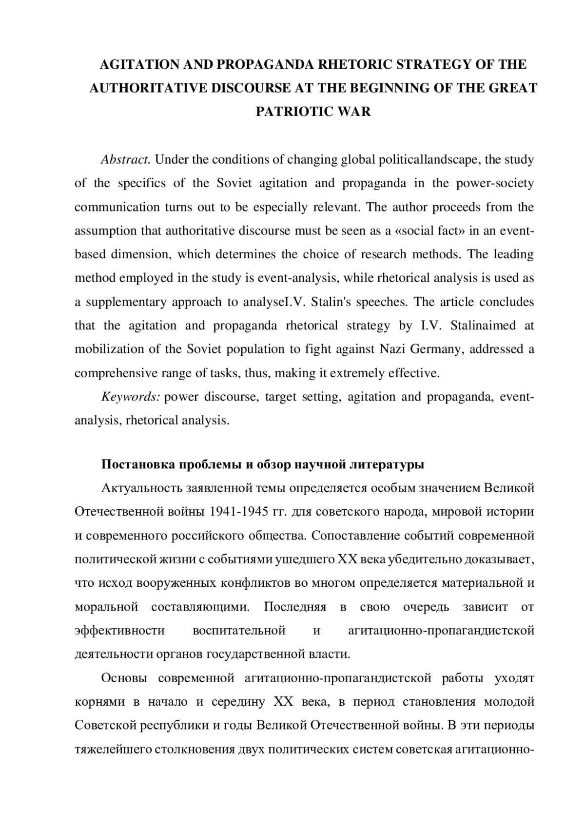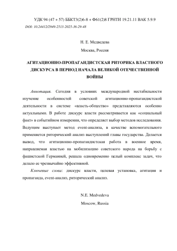 Сегодня в условиях международной нестабильности изучение особенностей советской агитационно-пропагандистской деятельности в системе «власть-общество» представляются особенно актуальными. В работе дискурс власти рассматривается как «социальный факт» в событийном измерении, что определяет выбор методов исследования. Ведущим выступает метод event-анализа, в качестве вспомогательного применяется риторический анализ выступлений главы государства. Делается вывод, что агитационно-пропагандистская работа в военное время, направляемая властью на мобилизацию советского народа на борьбу с фашистской Германией, решала одновременно целый комплекс задач, что делало ее чрезвычайно эффективной.