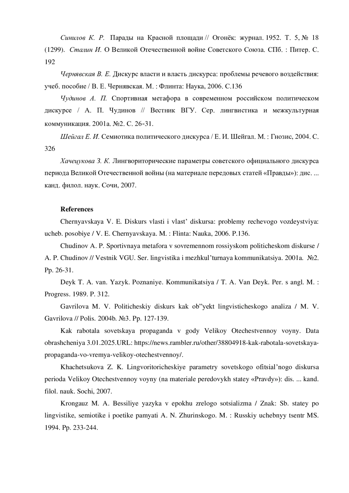 23. Хачецукова З. К. Лингвориторические параметры советского официального дискурса периода Великой Отечественной войны (на материале передовых статей “Правды”): дис.... канд. филол. наук. Сочи, 2007.
