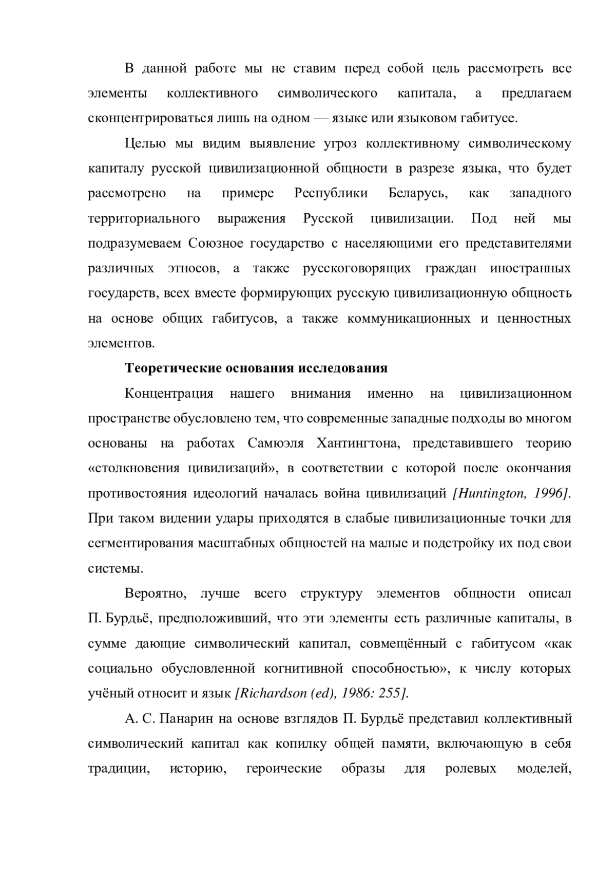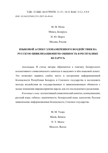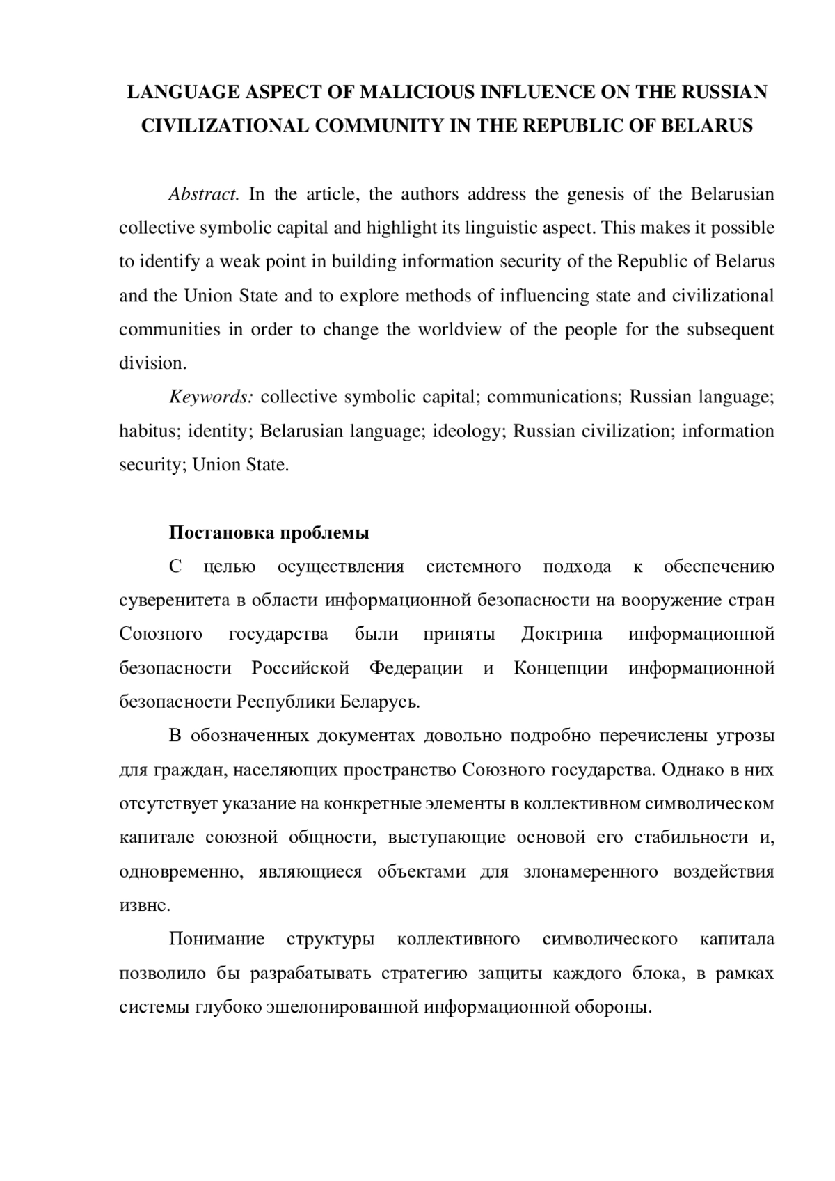 В статье авторы обращаются к генезису белорусского коллективного символического капитала и выделяют в нём языковой аспект. Это позволяет выявить слабое место в построении информационной безопасности Республики Беларусь и Союзного государства и исследовать методы воздействия на государственную и цивилизационную общности с целью изменения мировосприятия народа для его последующего разделения.