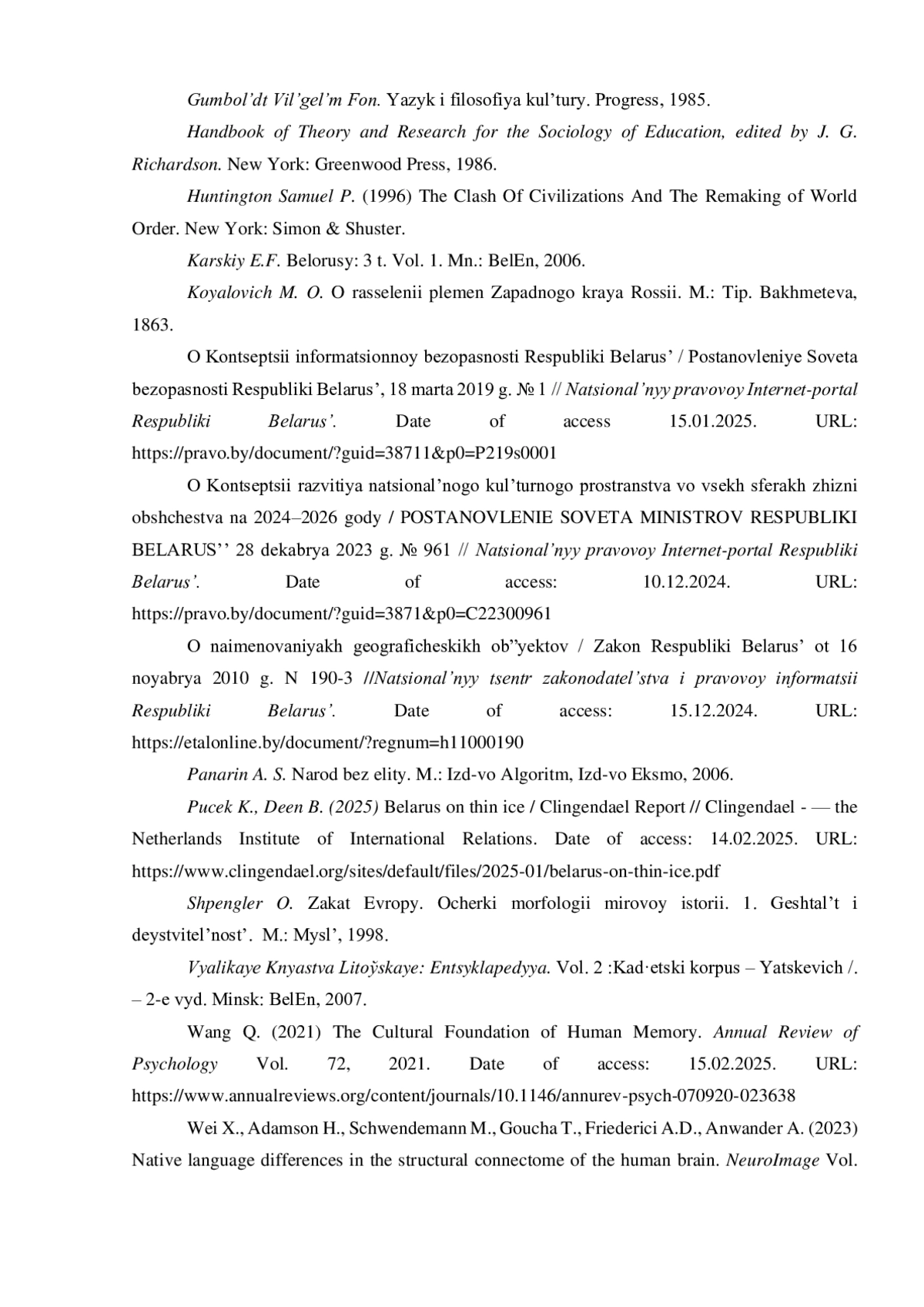 10. О Концепции развития национального культурного пространства во всех сферах жизни общества на 2024-2026 годы / ПОСТАНОВЛЕНИЕ СОВЕТА МИНИСТРОВ РЕСПУБЛИКИ БЕЛАРУСЬ 28 декабря 2023 г. № 961 // Национальный правовой Интернет-портал Республики Беларусь. Дата обращения 10.12.2024. URL: https://pravo.by/document/?guid=3871&p0=C22300961.