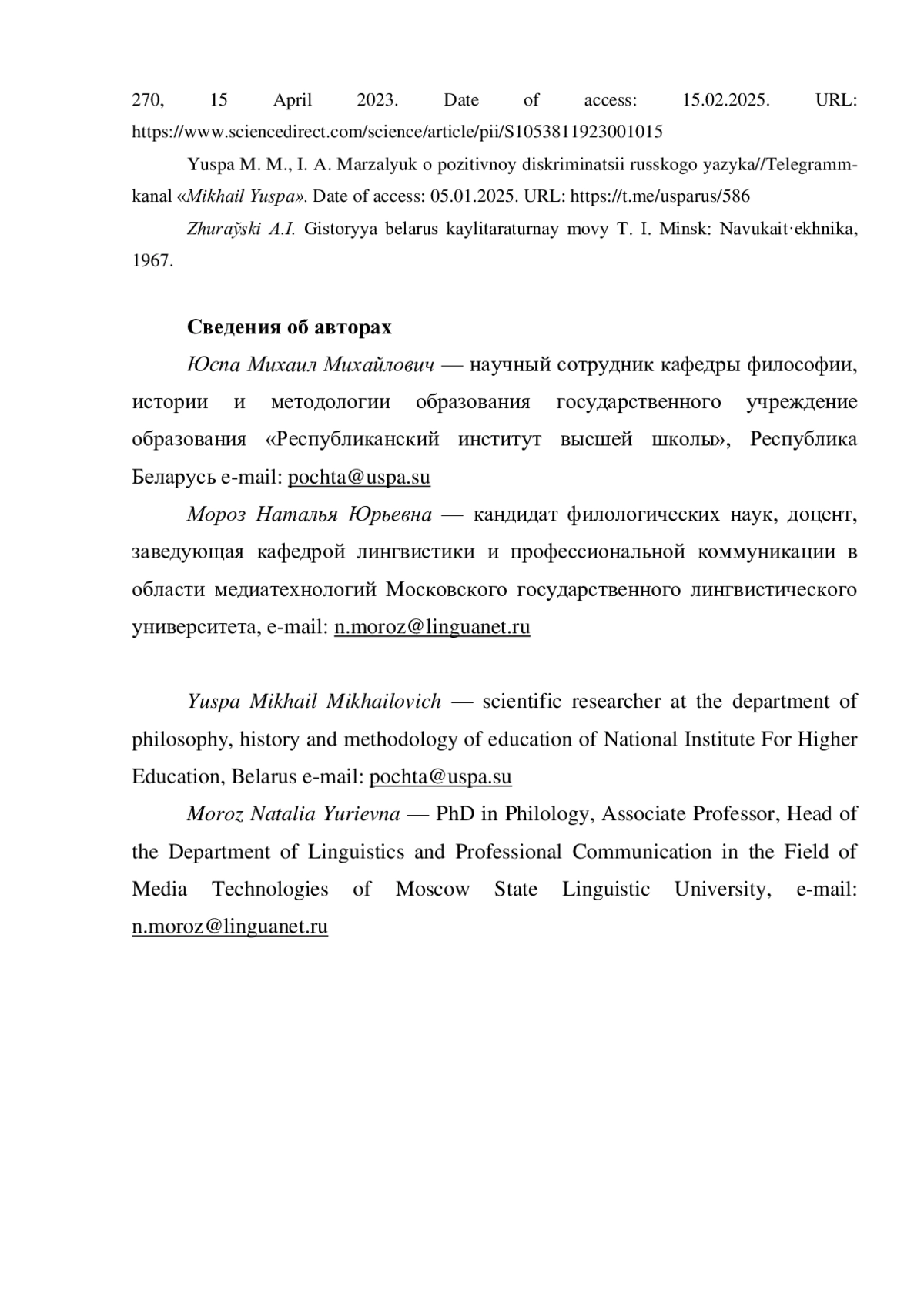 15. Юспа М. М., И. А. Марзалюк о позитивной дискриминации русского языка // Телеграмм-канал “Михаил Юспа”. Датаобращения 05.01.2025. URL: https://t.me/usparus/586.