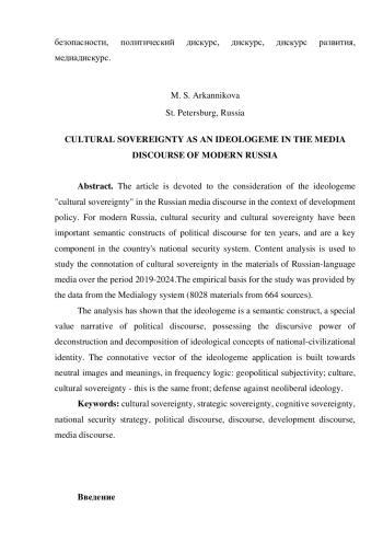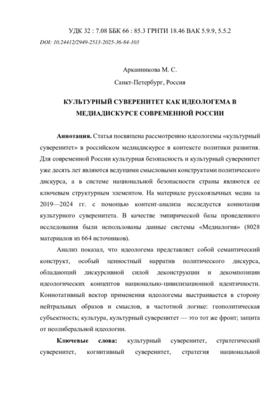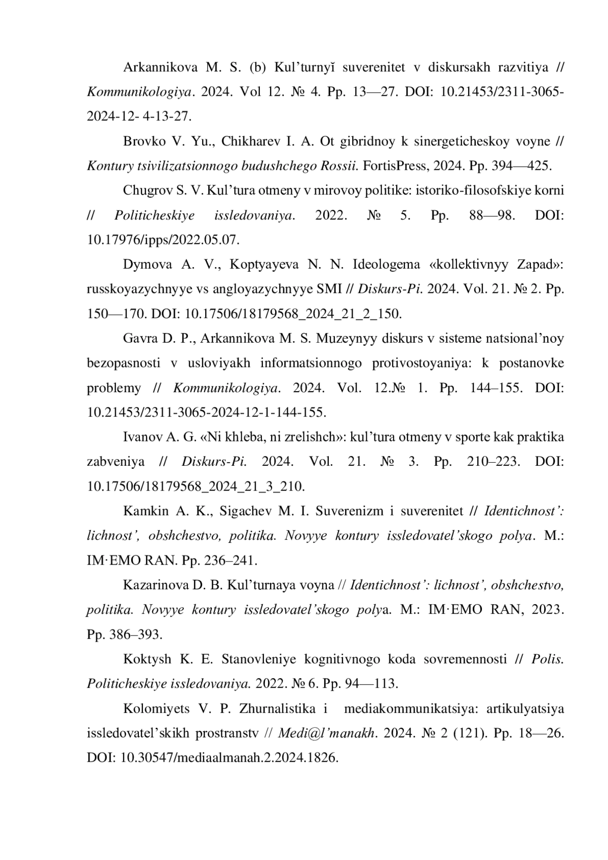 3. 	Арканникова М. С. (б) Культурный суверенитет в дискурсах развития // Коммуникология. 2024. Том 12. № 4. C. 13-27. 10.21453/2311-3065-2024-12- 4-13-27. DOI: 10.21453/2311-3065-2024-12-4-13-27