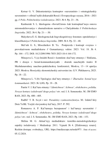 14. 	Коцур Г. В. Деконтестация концептов “суверенитет” и “стратегический суверенитет” в официальных дискурсах России и Европейского союза, 2016-2021 гг. // Полис. Политические исследования. 2023. № 4. С. 23-36.