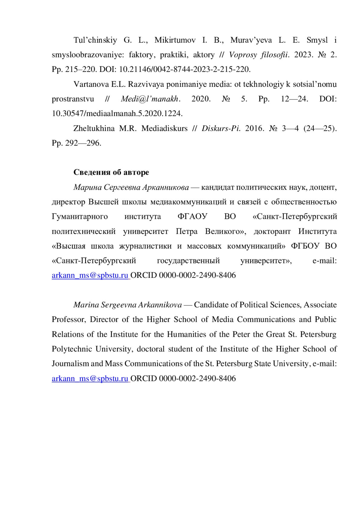 2. 	Арканникова М. С. (а) Музейный дискурс: к исследованию контекста // Меди@льманах. 2024. № 3 (122). С. 18-24. DOI: 10.30547/mediaalmanah.3.2024.1824