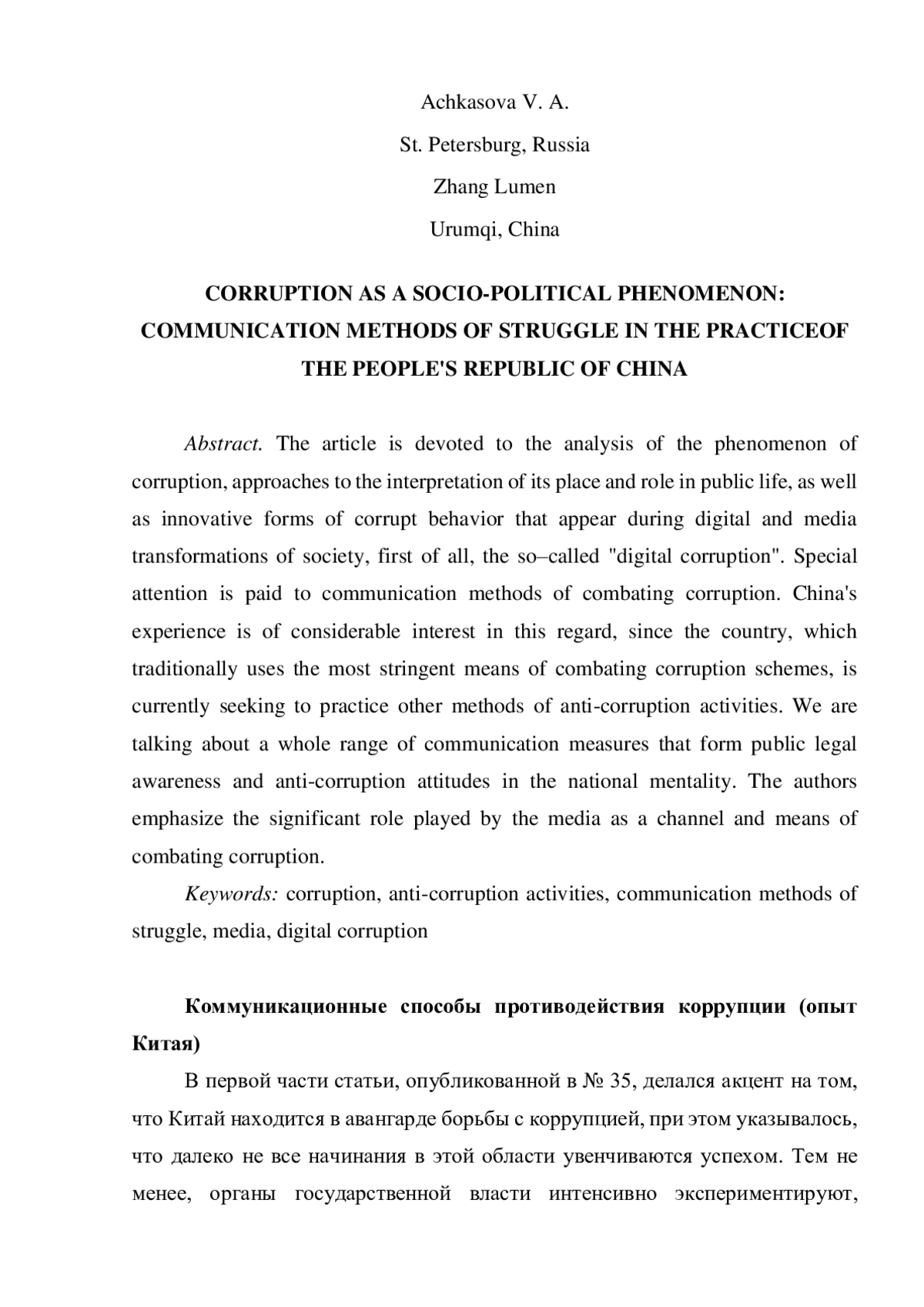 Статья посвящена анализу феномена коррупции, подходам к интерпретации ее места и роли в общественной жизни, а также инновационным формам коррупционного поведения, появляющимся в ходе цифровых и медийных трансформаций социума, — в первую очередь, т. н. «цифровой коррупции». Особое внимание уделяется коммуникационным способам противодействия коррупции. Опыт Китая представляет в этом отношении значительный интерес, поскольку страна, традиционно использующая наиболее жесткие средства борьбы с коррупционными схемами, в настоящее время стремится практиковать и иные методы антикоррупционной деятельности. Речь идет о целом комплексе коммуникационных мер, формирующих общественное правосознание и антикоррупционные установки в национальном менталитете. Авторы делают акцент на той значимой роли, которую играют медиа в качестве канала и средства борьбы с коррупцией.