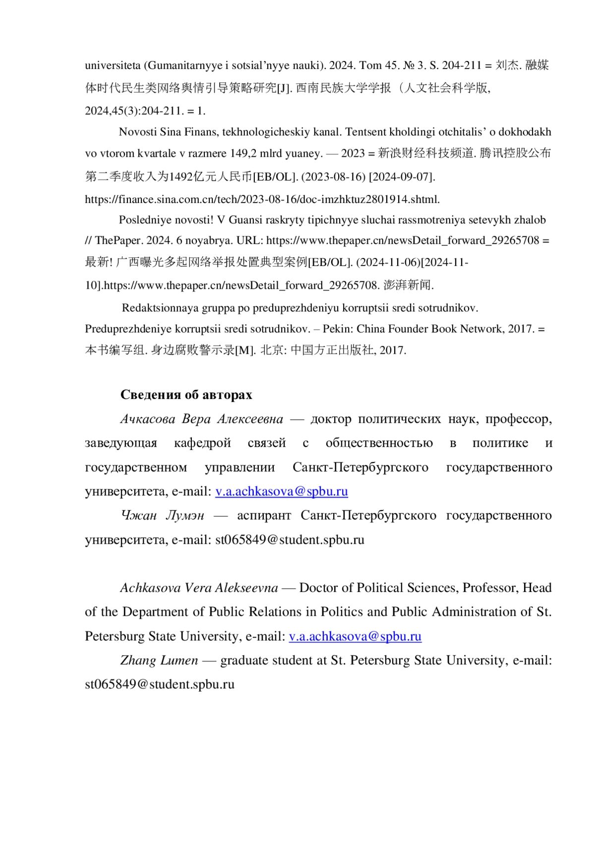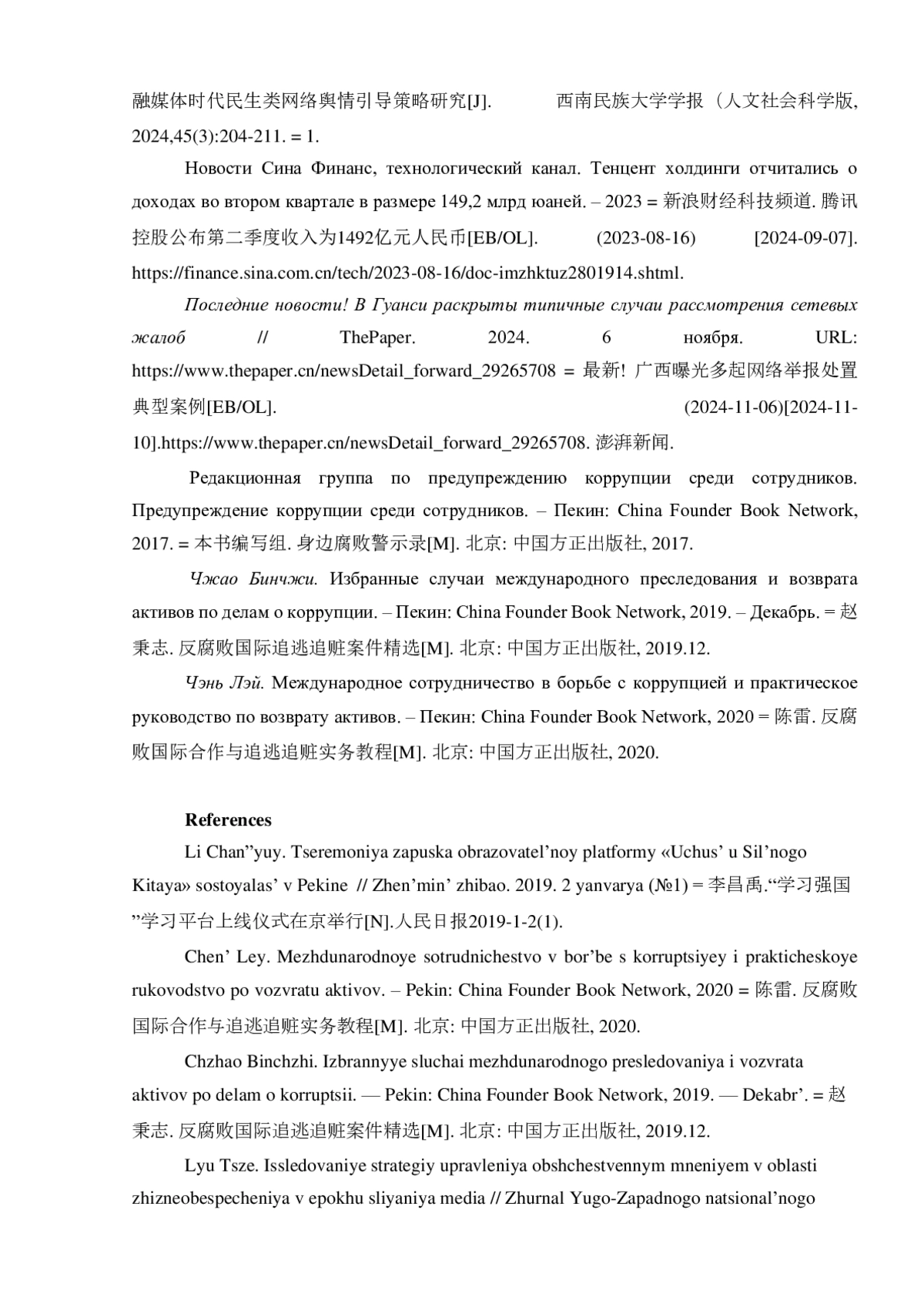 2. 	Лю Цзе. Исследование стратегий управления общественным мнением в области жизнеобеспечения в эпоху слияния медиа // Журнал Юго-Западного национального университета (Гуманитарные и социальные науки). 2024. Том 45. № 3. С. 204-211 = 刘杰. 融媒体时代民生类网络舆情引导策略研究[J]. 西南民族大学学报 人文社会科学版, 2024,45(3):204-211. = 1.