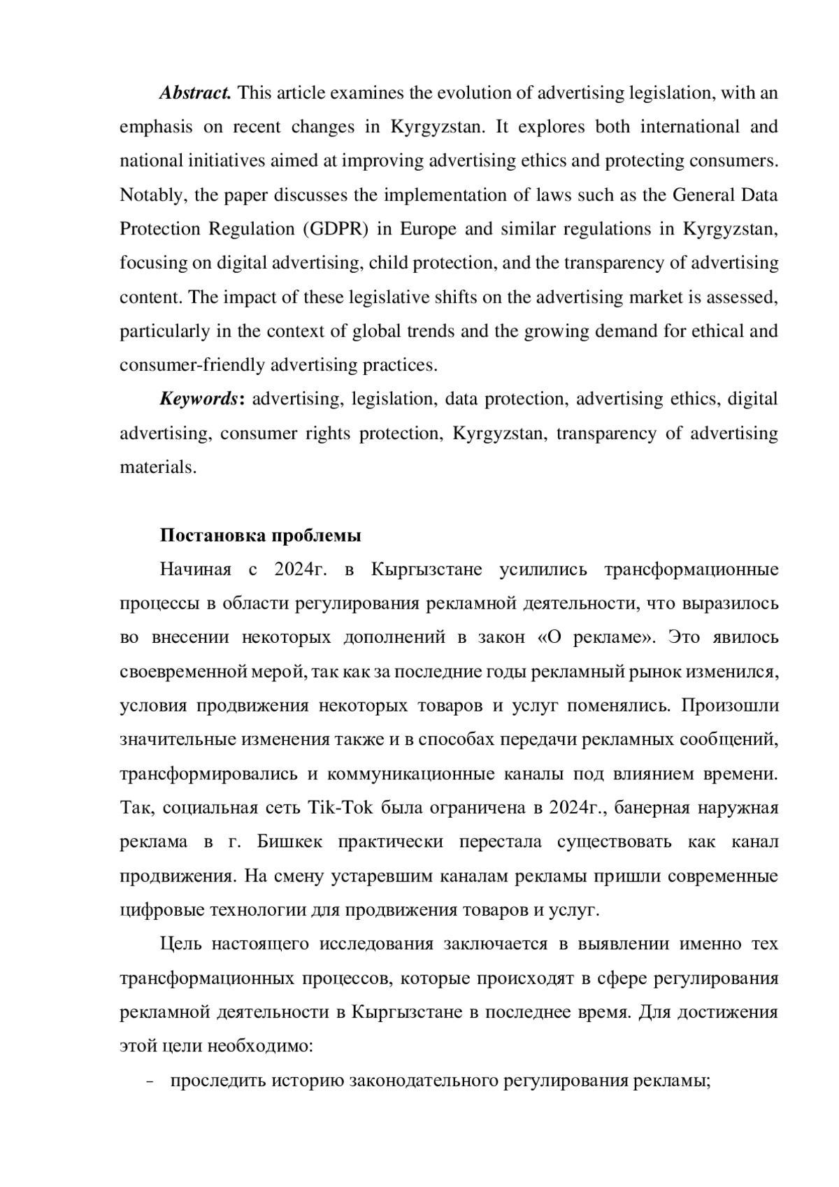Статья анализирует эволюцию законодательства в сфере рекламы, с акцентом на изменения, происходящие в Кыргызстане. Рассматриваются международные и национальные инициативы, направленные на улучшение этики рекламы и защиту прав потребителей. Особое внимание уделяется внедрению законов. Оценивается влияние современных законодательных изменений на рекламный рынок, особенно в контексте глобальных тенденций и растущего спроса на этичную и ориентированную на потребителя рекламу.