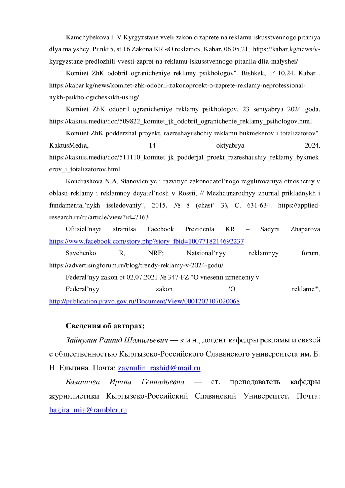 13. Камчыбекова И. В Кыргызстане ввели закон о запрете на рекламу искусственного питания для малышей. Пункт 5, ст.16 Закона КР “О рекламе”. Кабар, 06.05.21. https://kabar.kg/news/v-kyrgyzstane-predlozhili-vvesti-zapret-na-reklamu-iskusstvennogo-pitaniia-dlia-malyshei.