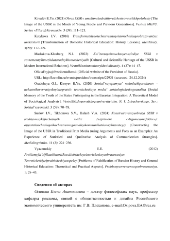 8. 	Ковалев Э.Ю. Образ СССРвумах молодежи и предшествовавших поколений // Вестник МГПУ. Серия “Философские науки”. 2021. № 3 (39). С. 111-121.