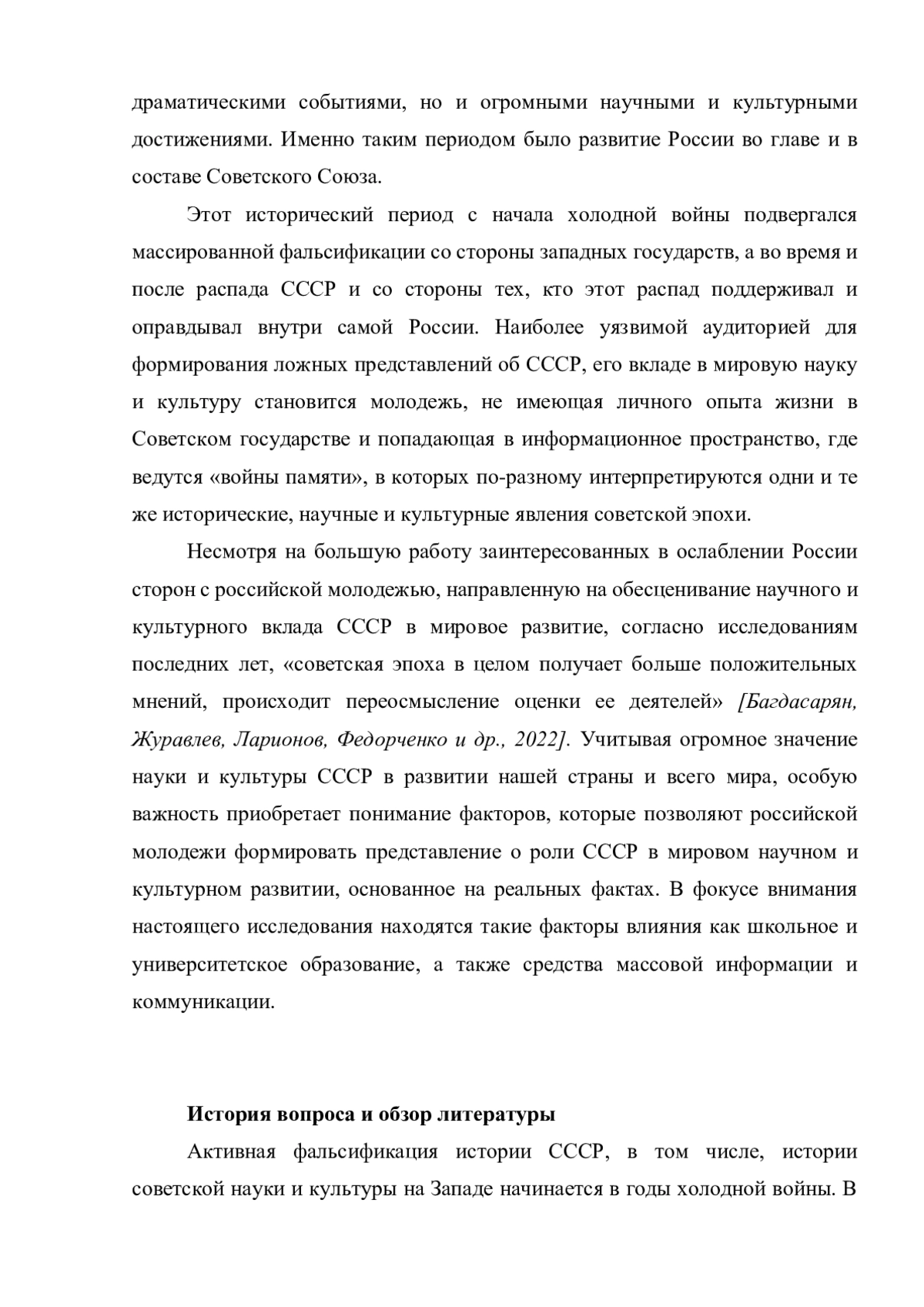 Историческая память играет важную роль в эволюции цивилизационной идентичности стран, поскольку «самосознание любого общества начинается с истории» [Горшков, Шереги, 2010: 195]. С исторической памятью связано понимание гражданами ценности своей страны, ее национальных интересов, духовно-исторического наследия и перспектив развития. Для России историческая память приобретает экзистенциальный характер в те периоды, когда возникает угроза суверенитету нашей страны. Но сохранение исторической памяти невозможно, если в ней искажаются периоды, сыгравшие важную роль в истории страны, отмеченные не только драматическими событиями, но и огромными научными и культурными достижениями. Именно таким периодом было развитие России во главе и в составе Советского Союза.