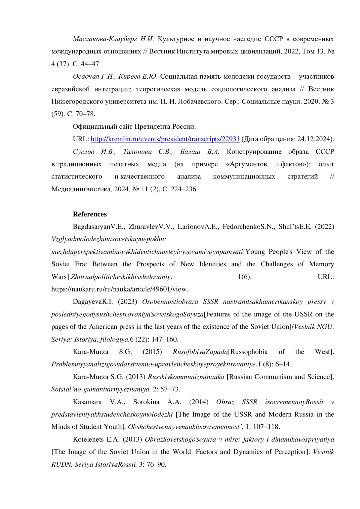 1. 	Багдасарян В.Э., Журавлев В.В., Ларионов А.Э., Федорченко С.Н., Шульц Э.Э. Взгляд молодежи на советскую эпоху: между перспективами новых идентичностей и вызовами войн памяти // Журнал политических исследований. 2022. Том 6. № 1. URL: https://naukaru.ru/ru/nauka/article/49601/view (Дата обращения: 24.11.2024).