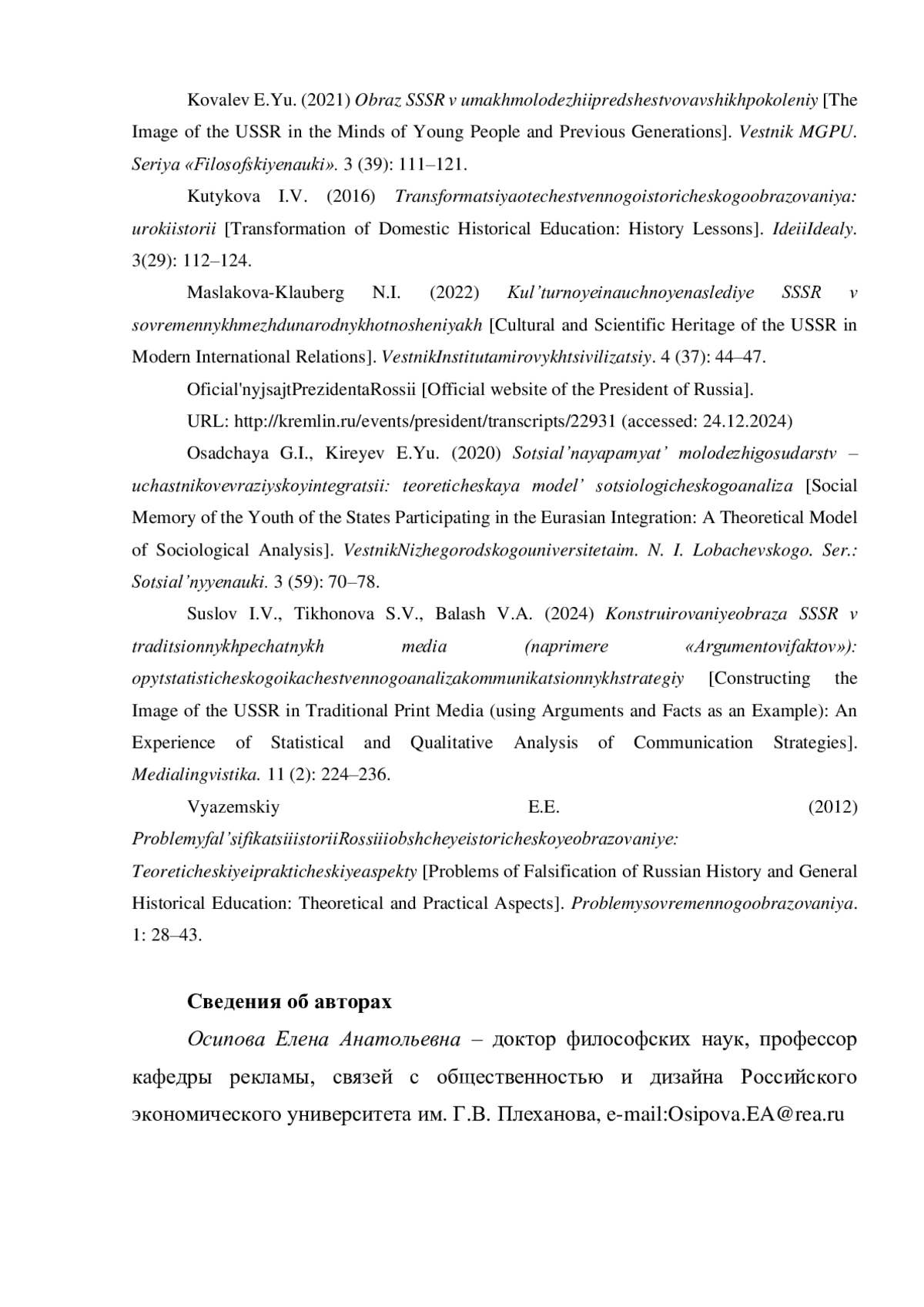 12. 	Суслов И.В., Тихонова С.В., Балаш В.А. Конструирование образа СССР в традиционных печатных медиа (на примере “Аргументов и фактов”): опыт статистического и качественного анализа коммуникационных стратегий // Медиалингвистика. 2024. № 11 (2), С. 224-236.