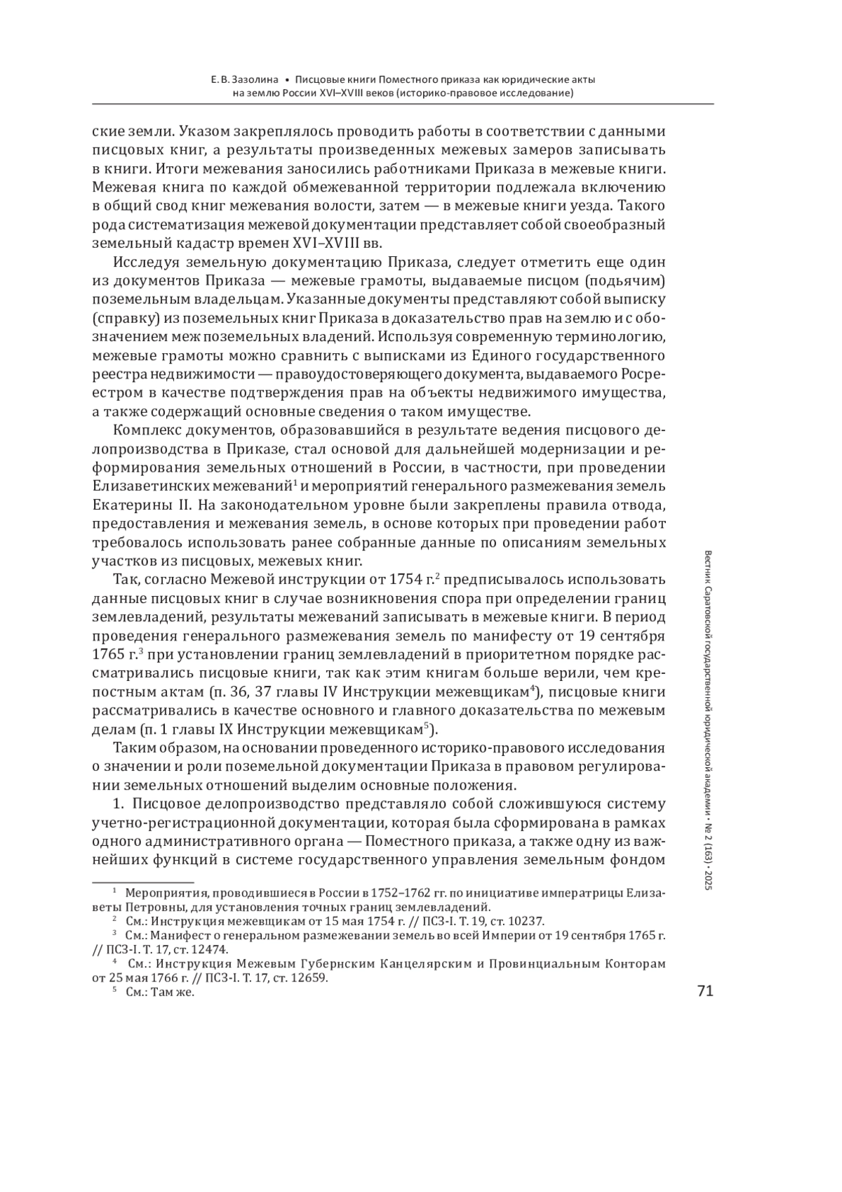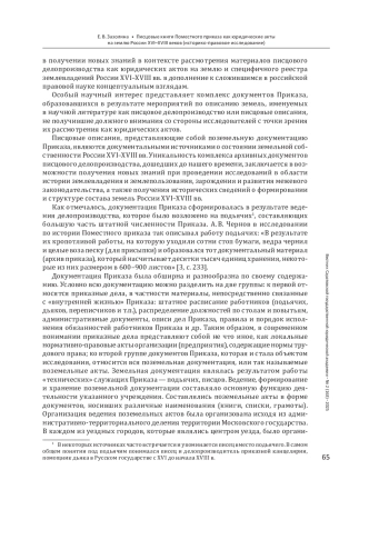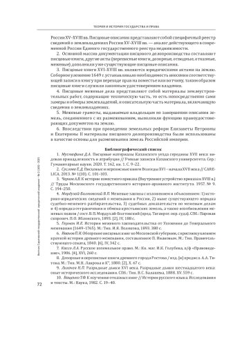 Введение: объектом историко-правового исследования является обширный комплекс документальных источников, составляющих материалы писцового делопроизводства, образовавшиеся в результате функционирования Поместного приказа. Отечественная историография насчитывает небольшой перечень работ, посвященных исследованию содержания документального материала Поместного приказа. Большинством специалистов документальные материалы рассматриваются в качестве массового статистического источника и финансовых документов, фиксировавших объекты налогообложения. Актуальность избранной тематики обусловлена необходимостью уточнения теоретических представлений о документах писцового делопроизводства как о специфичном реестре землевладений России XVI-XVIII вв. Цель - установить и обосновать историко-правовое значение писцовых описаний как юридических актов, закрепляющих права на землю России XVI-XVIII вв.