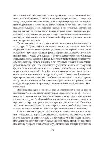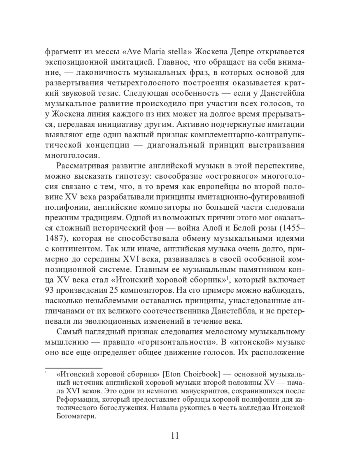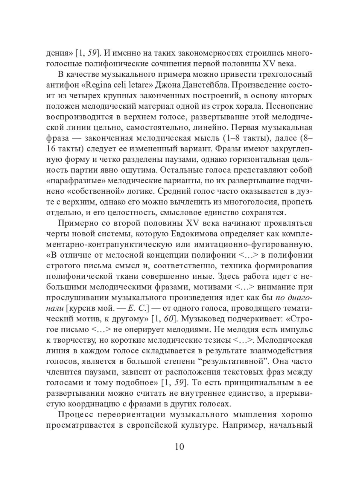 Для более рельефного выявления различий английской и европейской систем обратимся к концепции Ю. К. Евдокимовой, которая определяет «два основополагающих принципа» [1, 5] полифонии. Первый ориентируется на мелосную природу многоголосия. Согласно Евдокимовой, в мелосной концепции полифонии «исходным началом была мелодия, окруженная несколькими сопровождающими, сопутствующими голосами-мелодиями, и <…> сам процесс музыкального развития был подчинен линейной, горизонтальной [курсив мой. — Е. С.], мелодической логике» [1, 60].
