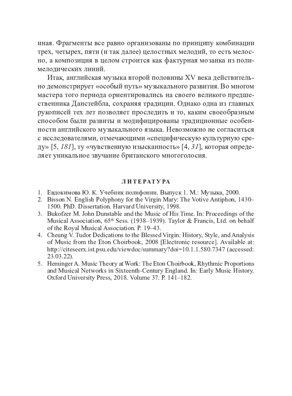 4. Cheung V. Tudor Dedications to the Blessed Virgin: History, Style, and Analysis of Music from the Eton Choirbook, 2008 [Electronic resource]. Available at: http://citeseerx.ist.psu.edu/viewdoc/summary?doi=10.1.1.580.7347 (accessed: 23.03.22).