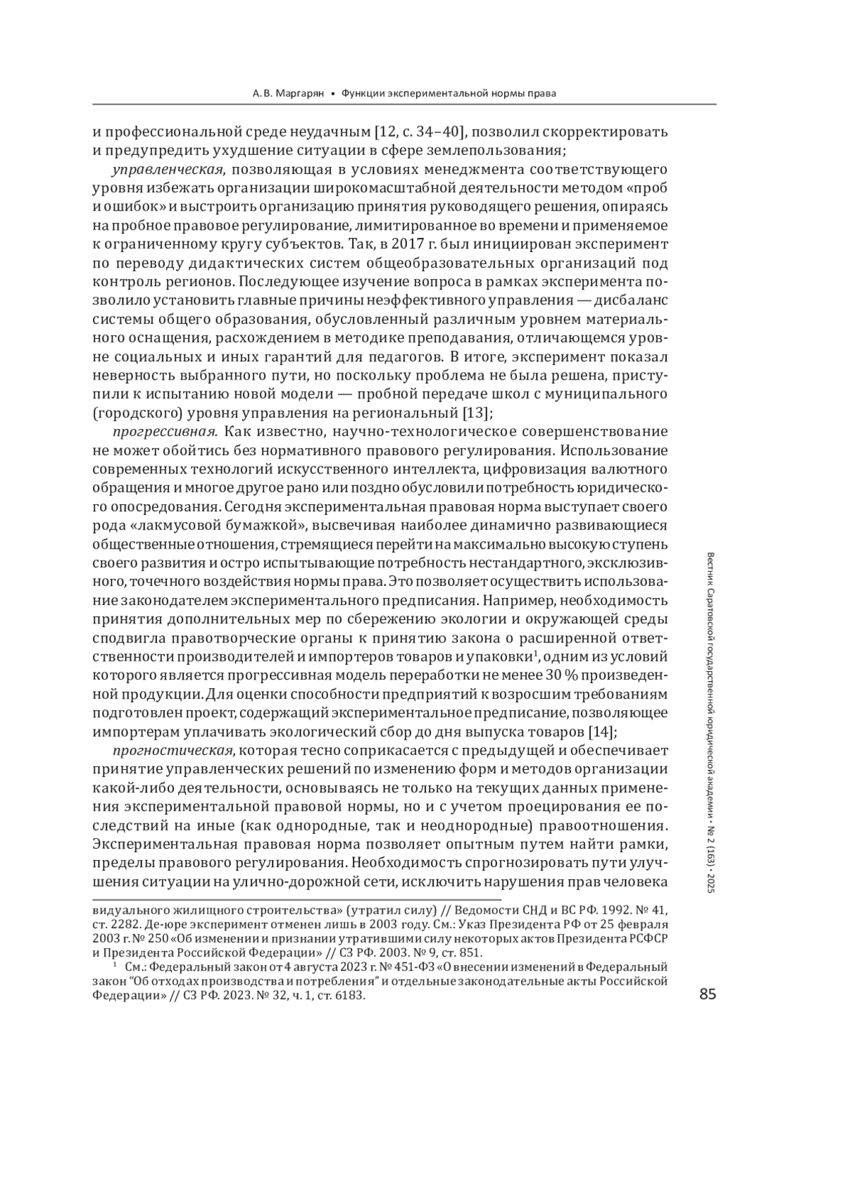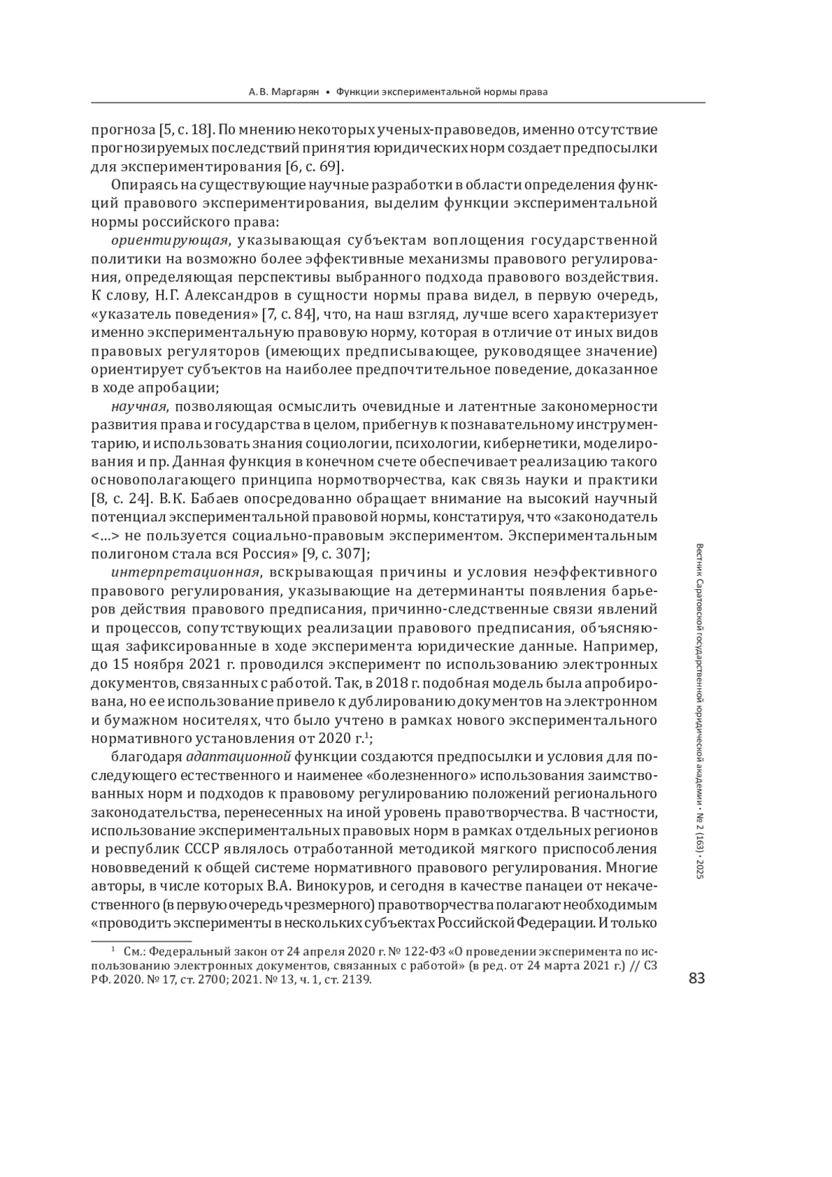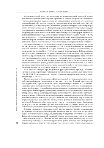 Функциональный аспект исследования экспериментальной правовой нормы обоснован потребностями теории и практики и крайне востребован. Методологическая функция как классической, так и современной теоретико-исторической правовой науки, обусловлена совершенствованием методов, опытной практической проверкой выдвигаемых научных положений, разработкой эффективных форм правового регулирования [1, c. 17].