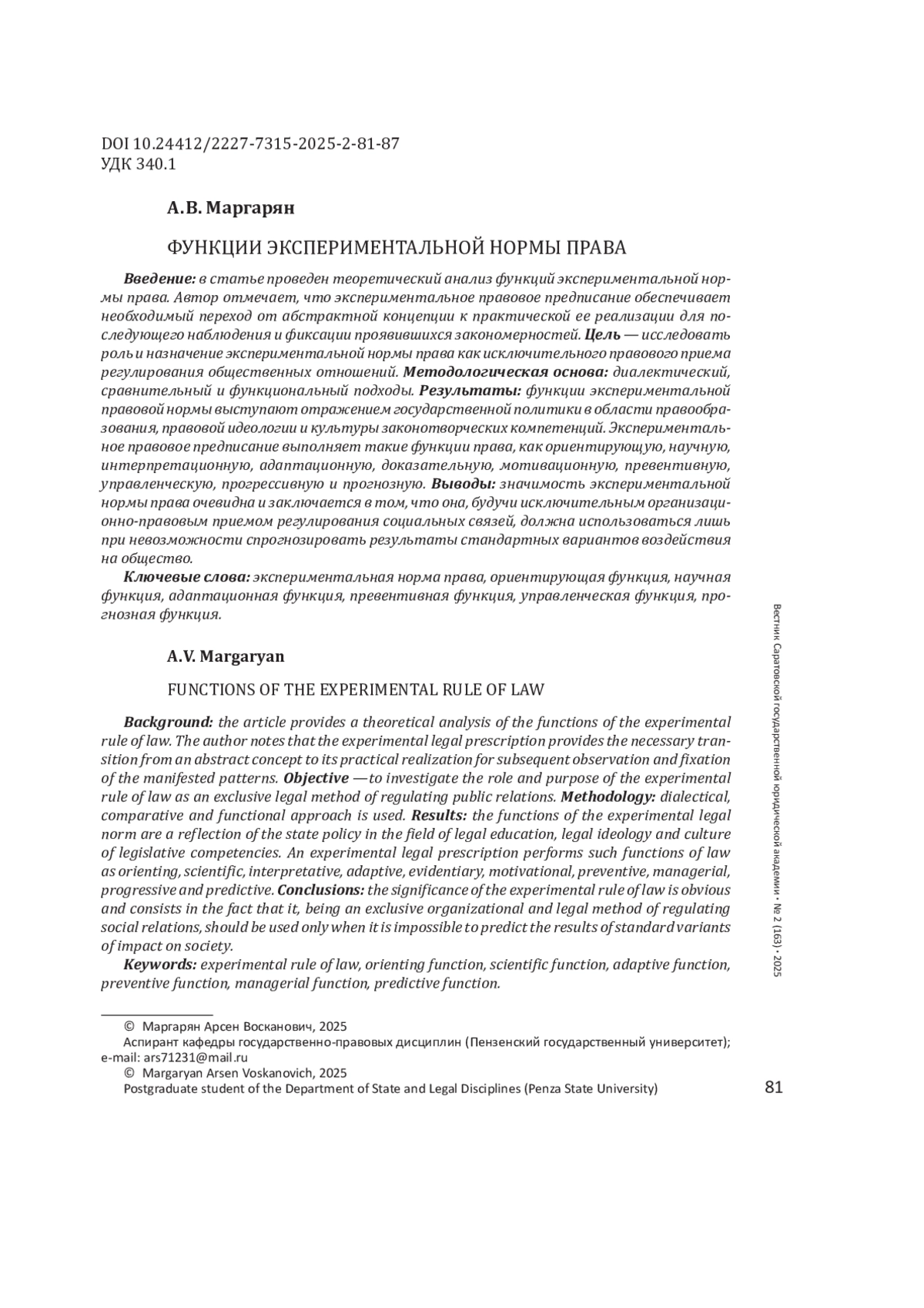Результаты: функции экспериментальной правовой нормы выступают отражением государственной политики в области правообразования, правовой идеологии и культуры законотворческих компетенций. Экспериментальное правовое предписание выполняет такие функции права, как ориентирующую, научную, интерпретационную, адаптационную, доказательную, мотивационную, превентивную, управленческую, прогрессивную и прогнозную.