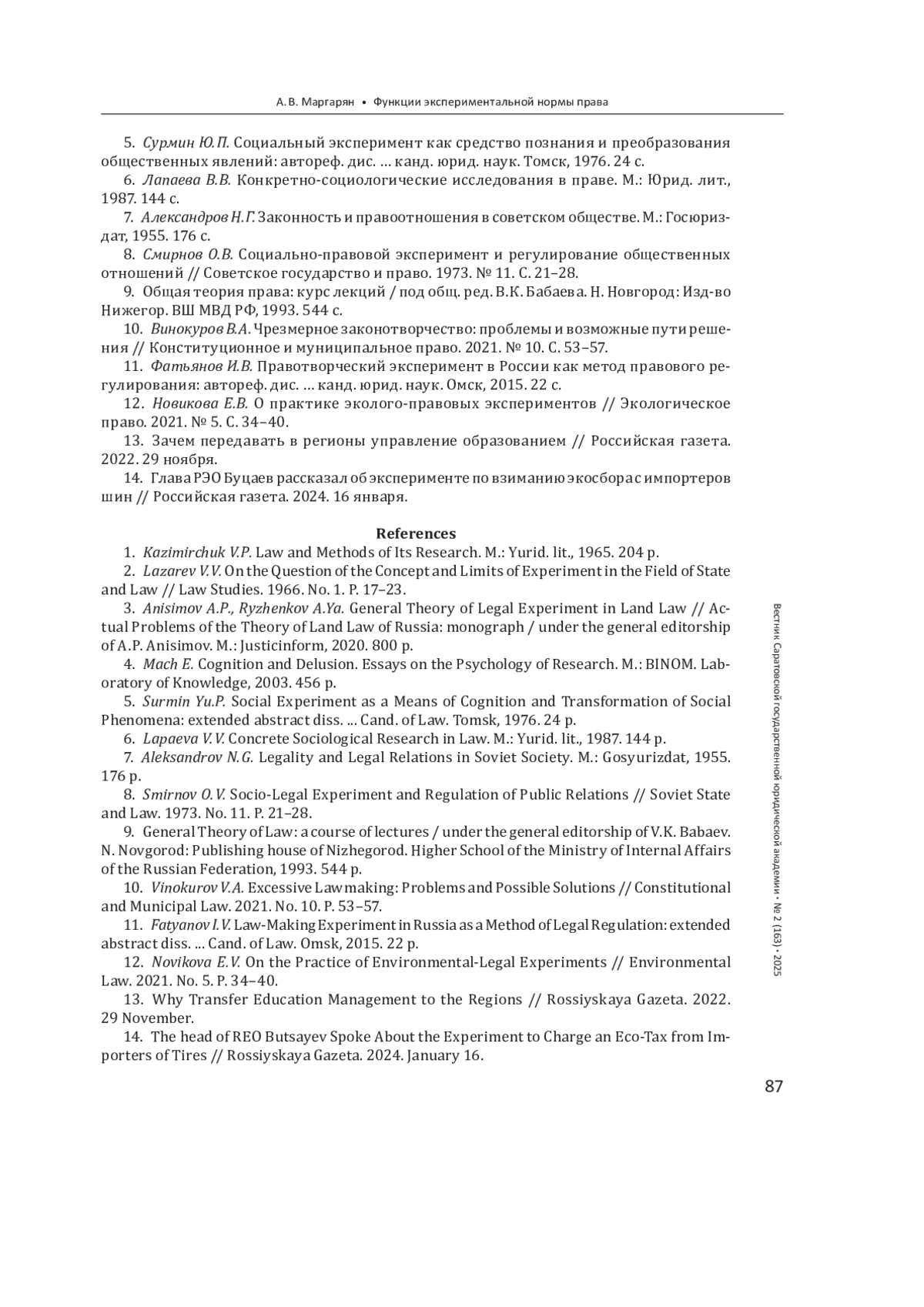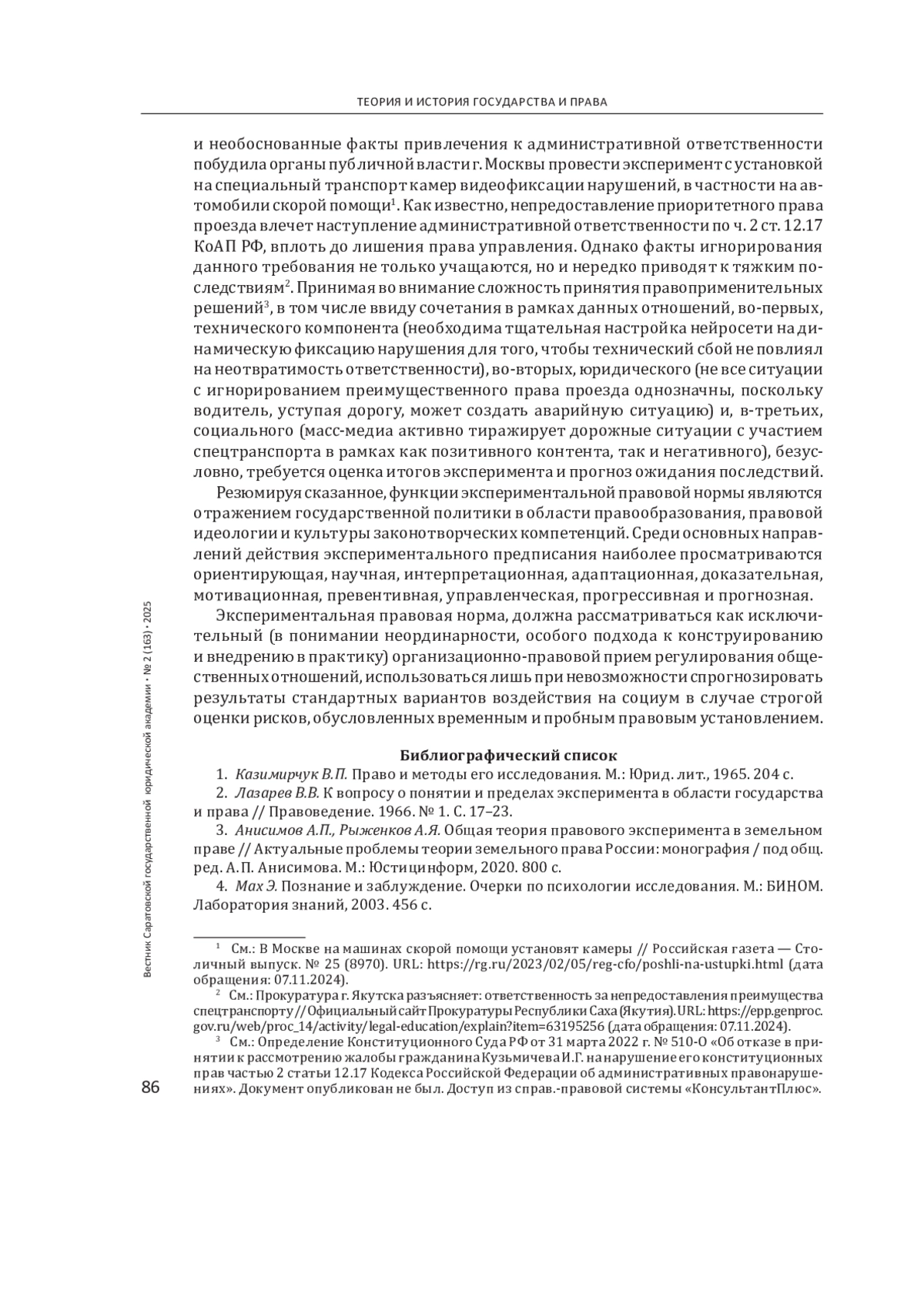 2. 	Лазарев В.В. К вопросу о понятии и пределах эксперимента в области государства и права // Правоведение. 1966. № 1. С. 17-23.
