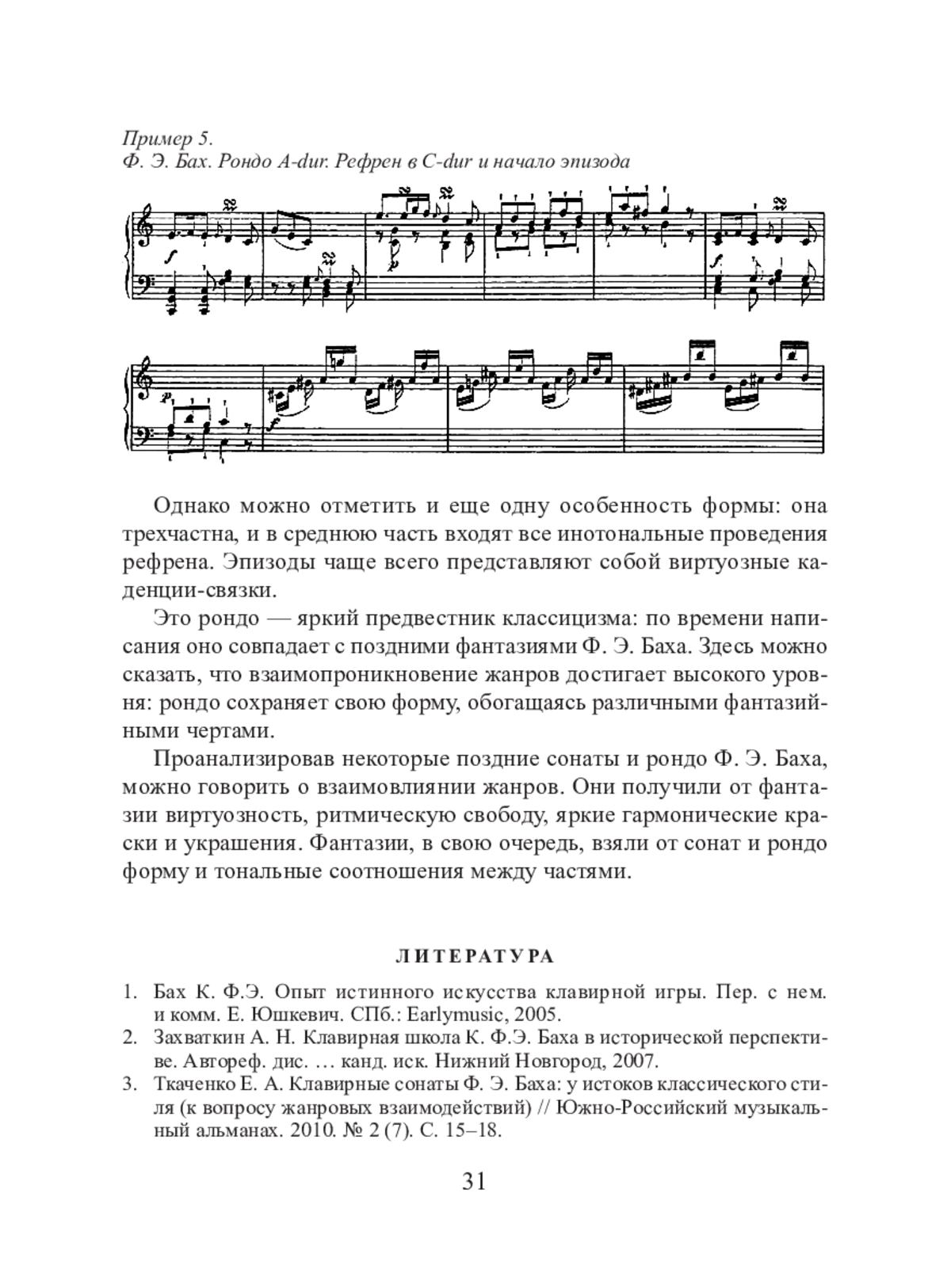 3. Ткаченко Е. А. Клавирные сонаты Ф. Э. Баха: у истоков классического стиля (к вопросу жанровых взаимодействий) // Южно-Российский музыкальный альманах. 2010. № 2 (7). С. 15–18.