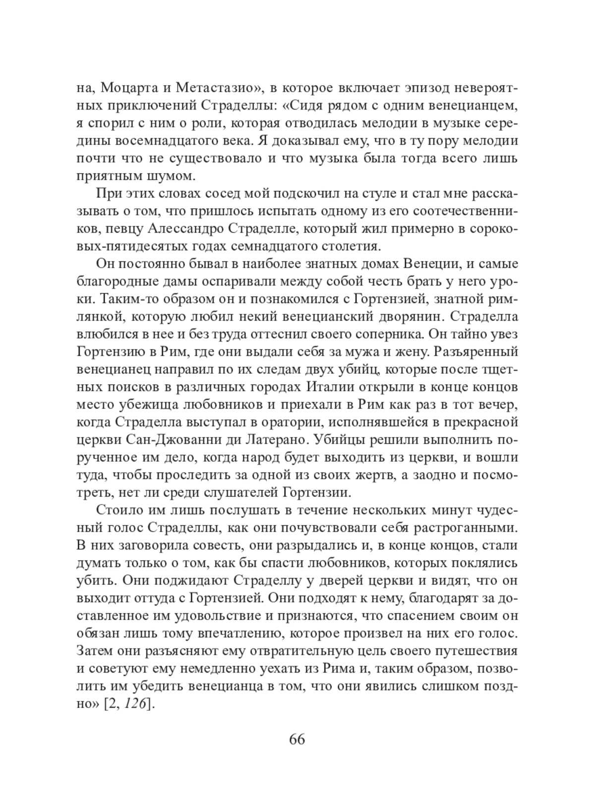 Уже в 1715 году, спустя три десятилетия после смерти композитора, во Франции выходит в свет «История музыки и ее эффектов»1. Этот трактат написали известные доктора медицины и меломаны Пьер Бурдело и его племянник Пьер Бонне-Бурдело. В «Истории музыки» впервые излагается биография Страделлы, занимающая около семи страниц [3, 59]. Правда, как показали более поздние исследования, она имеет мало общего с реальными фактами. Здесь Страделла предстает великим соблазнителем женщин, красота музыки которого способна «растопить каменные сердца» охотившихся на него убийц. Тем не менее, это была первая печатная публикация биографии Страделлы, которая быстро стала единственным историографическим справочным источником, несмотря на возможную недостоверность сведений. С некоторыми оговорками Чарлз Берни в своей «Всеобщей истории музыки» повторил захватывающее жизнеописание Страделлы, тем самым укореняя в веках мистифицированное изложение биографии [4, 100].