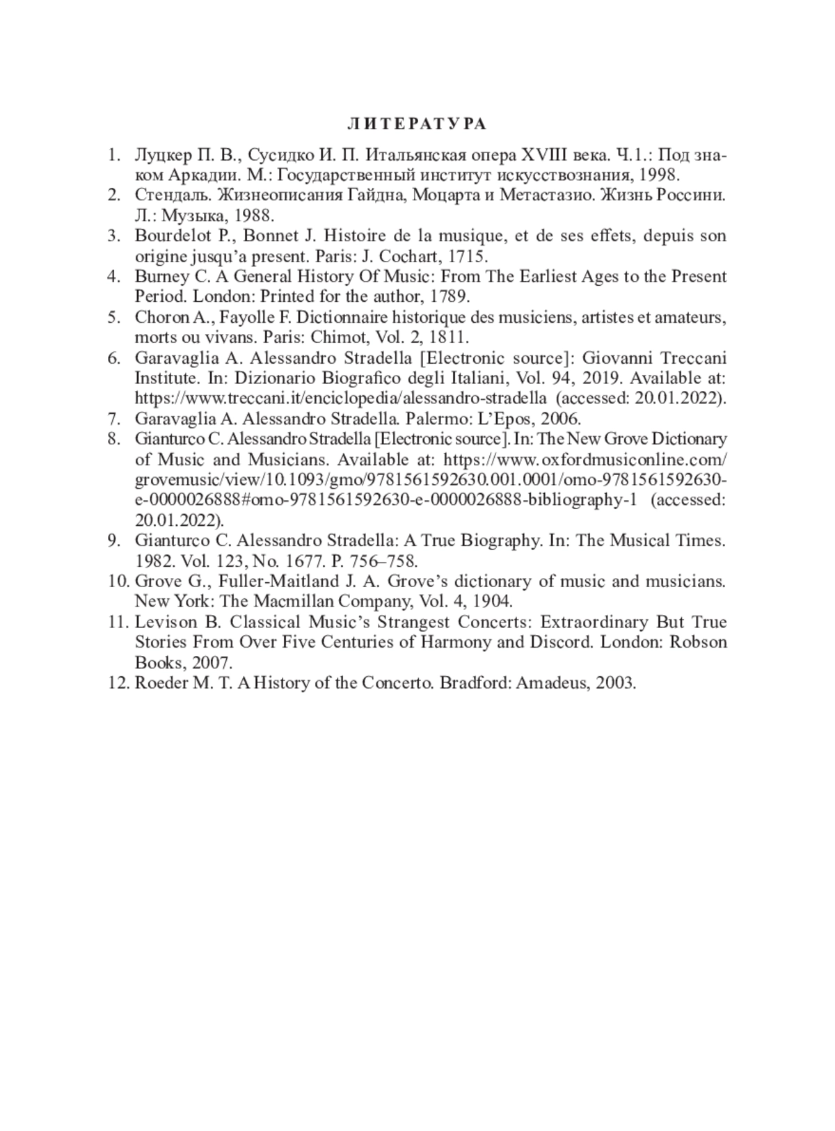 8. Gianturco C. Alessandro Stradella [Electronic source]. In: The New Grove Dictionary of Music and Musicians. Available at: https://www.oxfordmusiconline.com/ grovemusic/view/10.1093/gmo/9781561592630.001.0001/omo-9781561592630- e-0000026888#omo-9781561592630-e-0000026888-bibliography-1 (accessed: 20.01.2022).