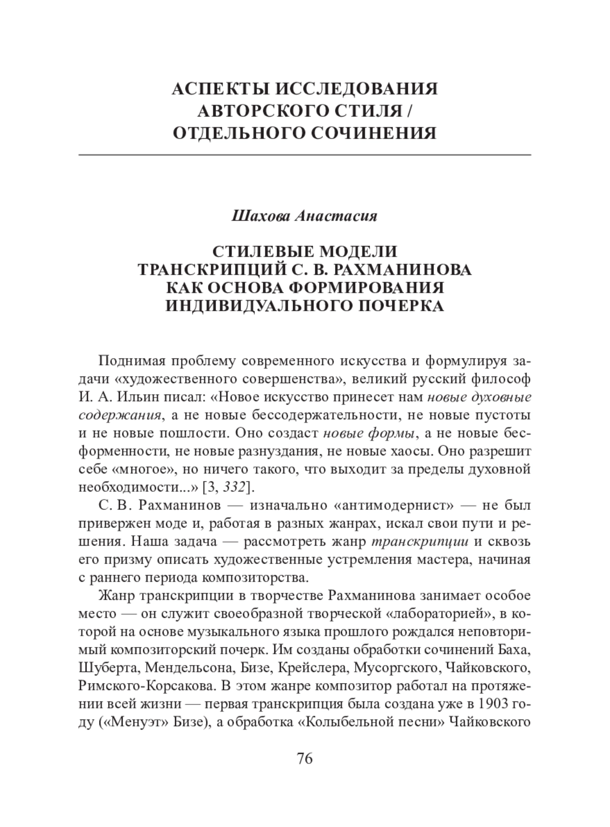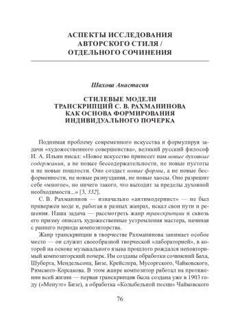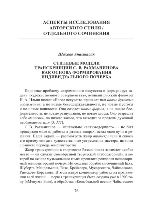 С. В. Рахманинов — изначально «антимодернист» — не был привержен моде и, работая в разных жанрах, искал свои пути и решения. Наша задача — рассмотреть жанр транскрипции и сквозь его призму описать художественные устремления мастера, начиная с раннего периода композиторства.