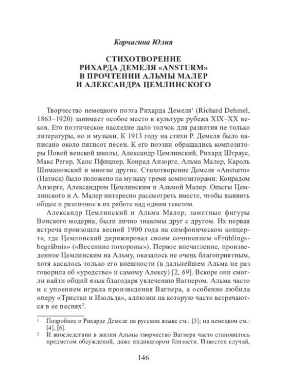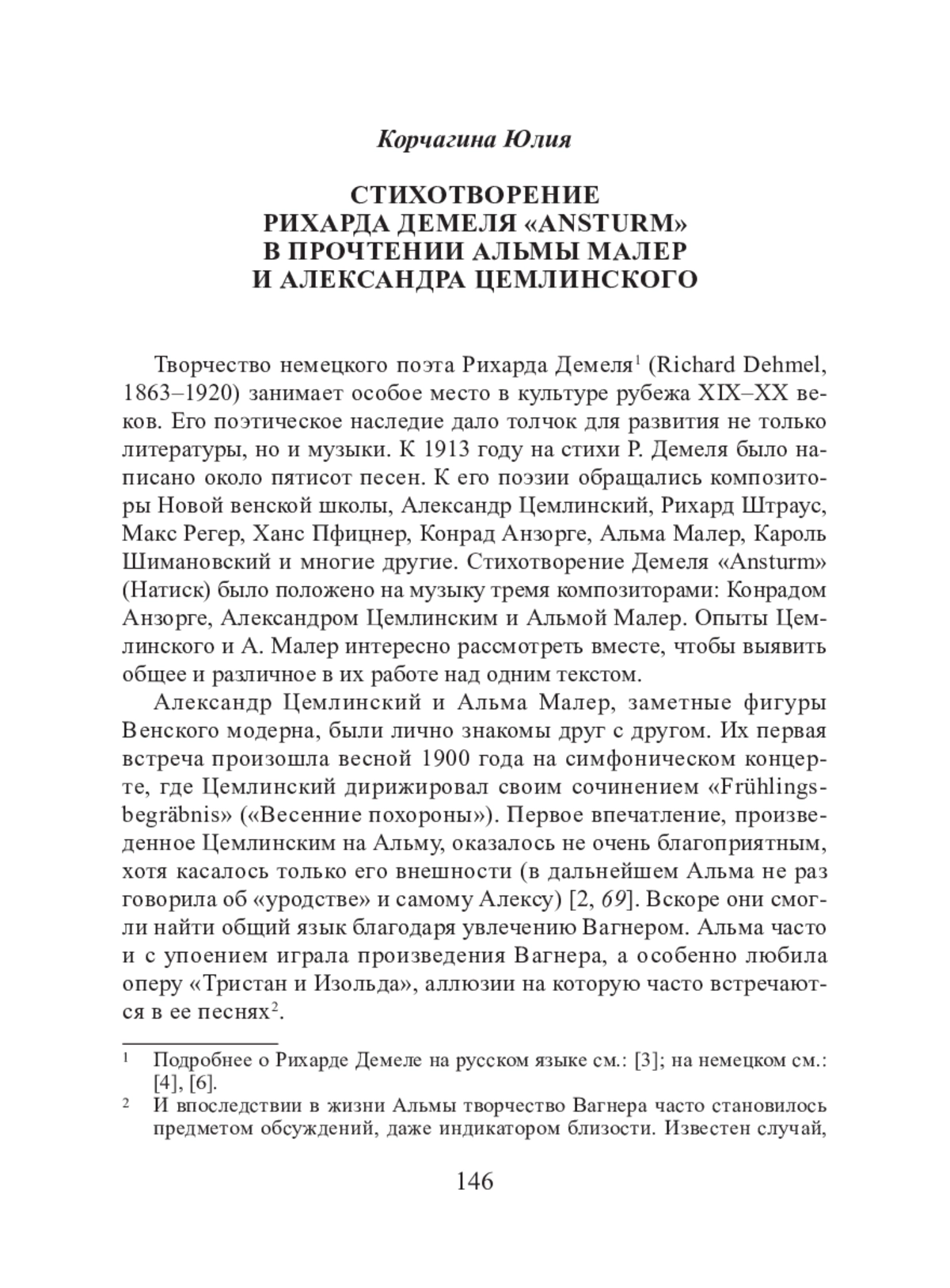 Творчество немецкого поэта Рихарда Демеля1 (Richard Dehmel, 1863–1920) занимает особое место в культуре рубежа XIX–XX веков. Его поэтическое наследие дало толчок для развития не только литературы, но и музыки. К 1913 году на стихи Р. Демеля было написано около пятисот песен. К его поэзии обращались композиторы Новой венской школы, Александр Цемлинский, Рихард Штраус, Макс Регер, Ханс Пфицнер, Конрад Анзорге, Альма Малер, Кароль Шимановский и многие другие. Стихотворение Демеля «Ansturm» (Натиск) было положено на музыку тремя композиторами: Конрадом Анзорге, Александром Цемлинским и Альмой Малер. Опыты Цемлинского и А. Малер интересно рассмотреть вместе, чтобы выявить общее и различное в их работе над одним текстом.